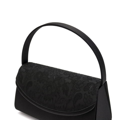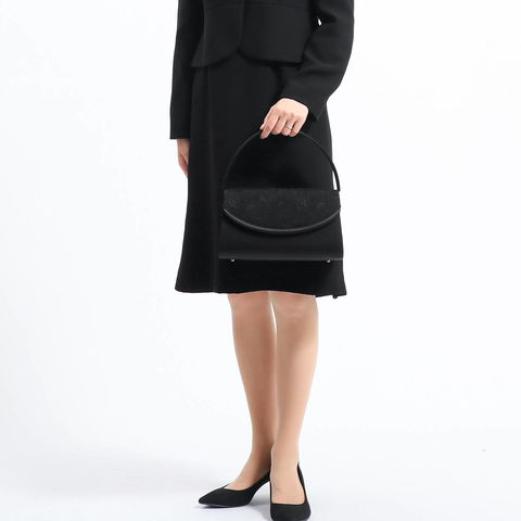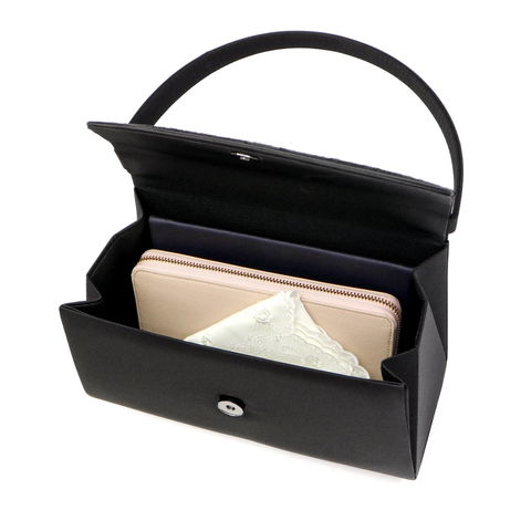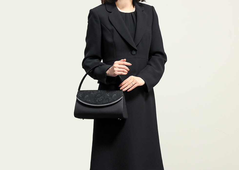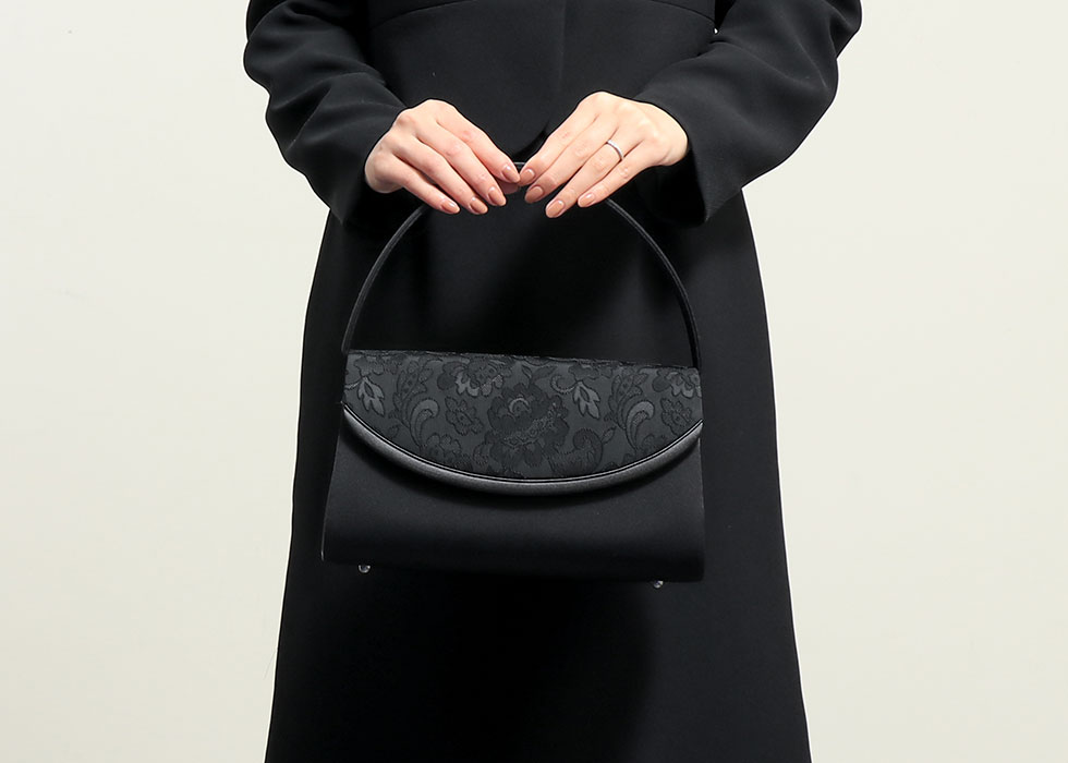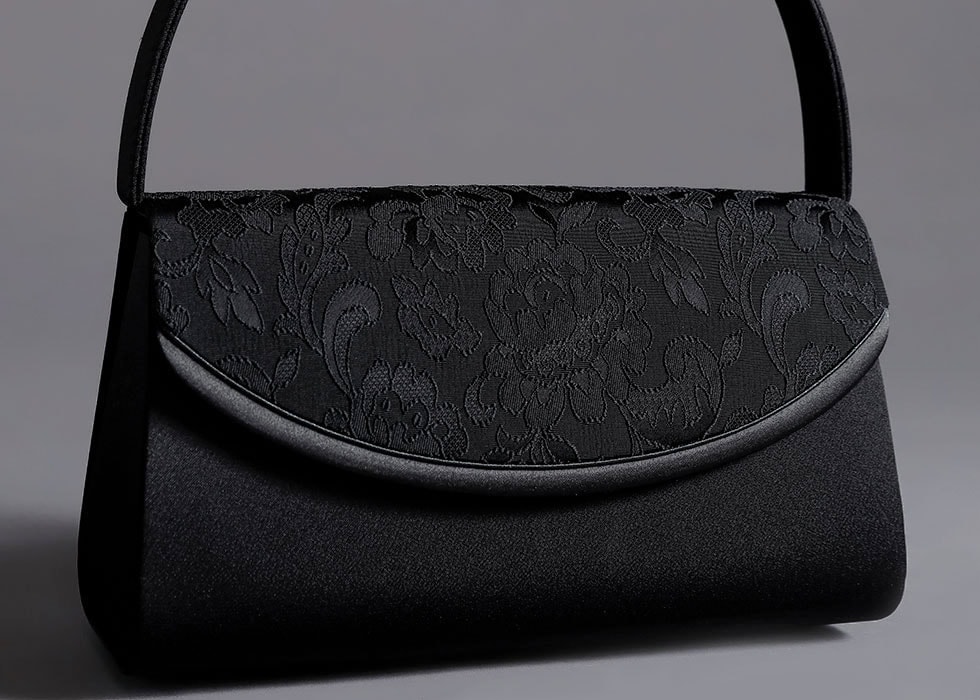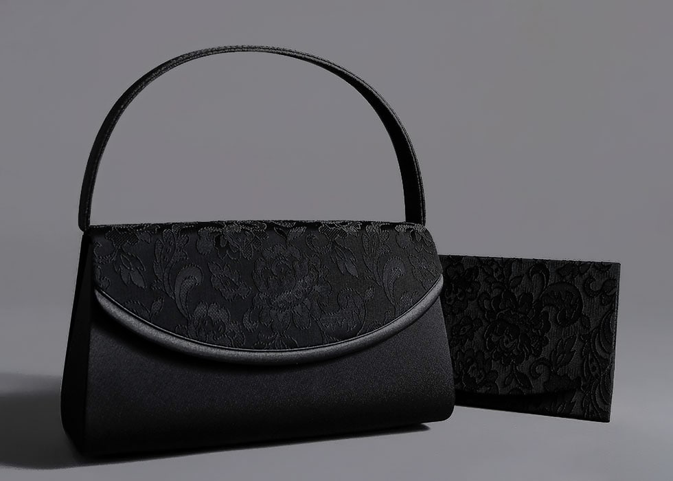 高級フォーマル素材の米沢織の中でも、レース調の織柄が印象的なジャカード素材をかぶせ部分に配したフォーマルバッグ。セットとなる袱紗には、同様の素材を全面に使用した贅沢な仕様となっています。初めてのフォーマルバッグにもおすすめしたい統一感のあるセットです。