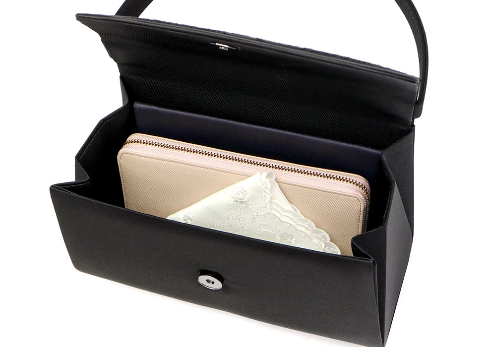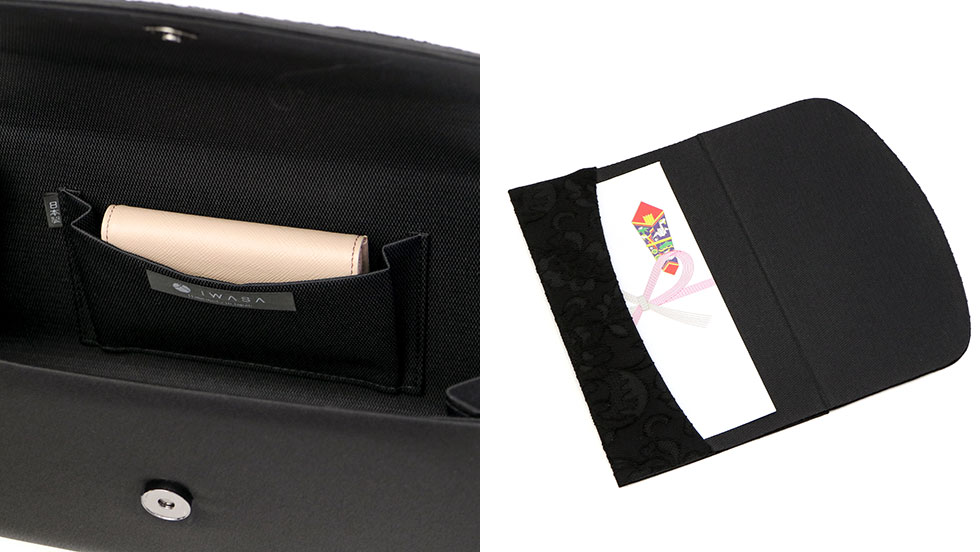 すっきりとした見た目ながら約10cmのマチ幅を備えていますので、長財布やハンカチ、袱紗などのアイテムをしっかりと収納可能です。また被せが大きく開き、物の出し入れもスムーズに行えます。撥水、撥油加工が施された素材なので、内ポケットには小物を、同素材の袱紗にはご祝儀や香典袋などを安心して管理できます。