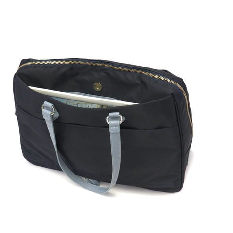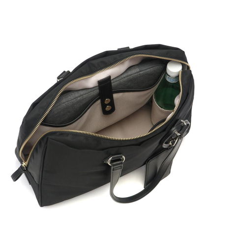 内側背面には片面にパッドが入ったポケットを設け、飛出し防止のスナップボタンも付いていますので、PCやタブレット等の収納におすすめ。他にもポケットやボトルホルダーを設け、バッグの中を綺麗に整理できます。また、外側前後にはB5サイズが入るポケットを備え、さっと取り出したい小物の収納に便利です。