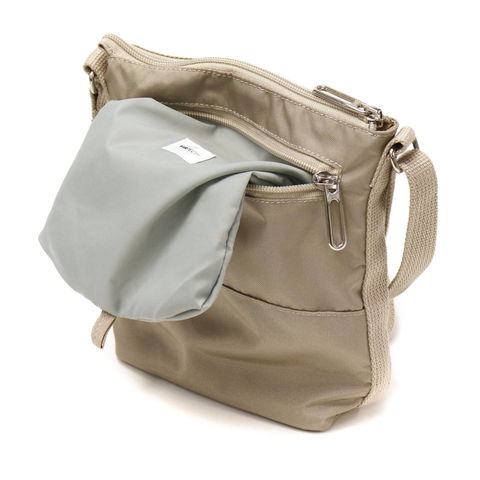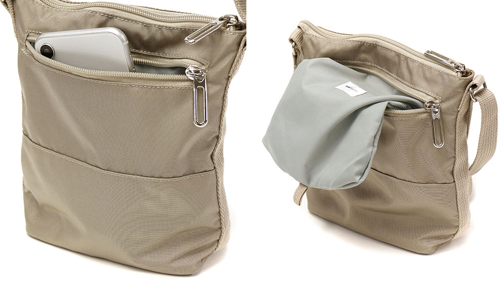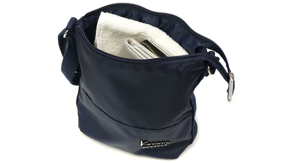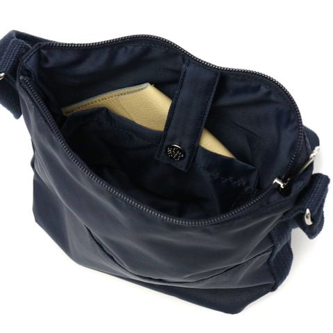 本体は二つ折りのお財布とスマホ、ハンドタオルなど、小物類の収納にぴったりなサイズ感。ちょっとそこまで、のお買い物やお出かけにはもちろん、旅行時のサブバッグとしても役立ちます。内装にはスナップポケットを1ヶ備えたつくりで、仕分け管理もできます。