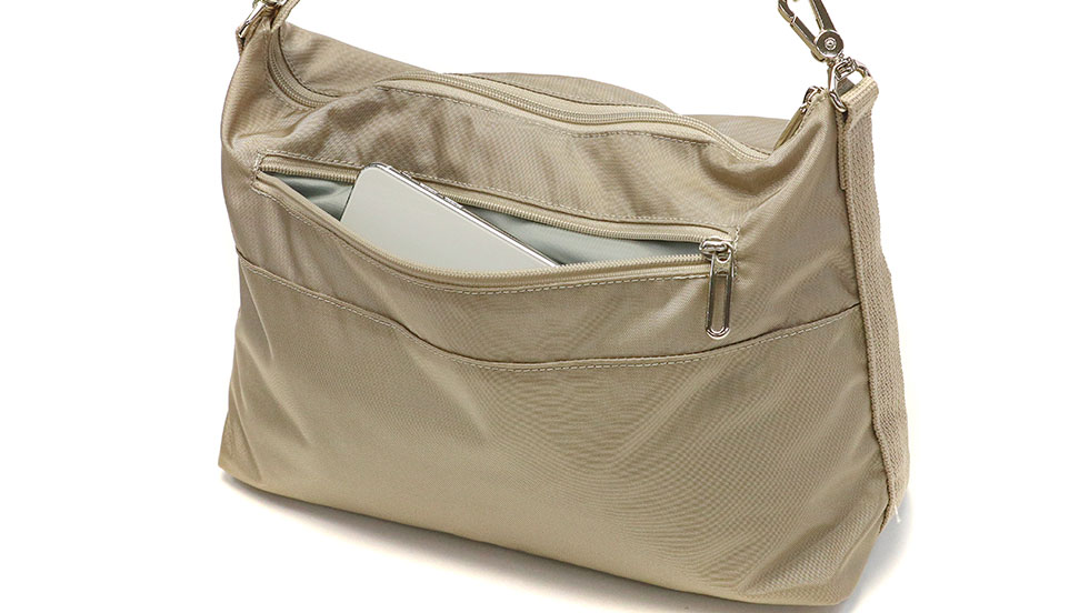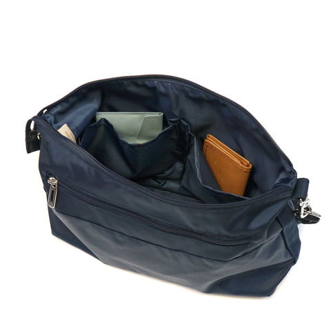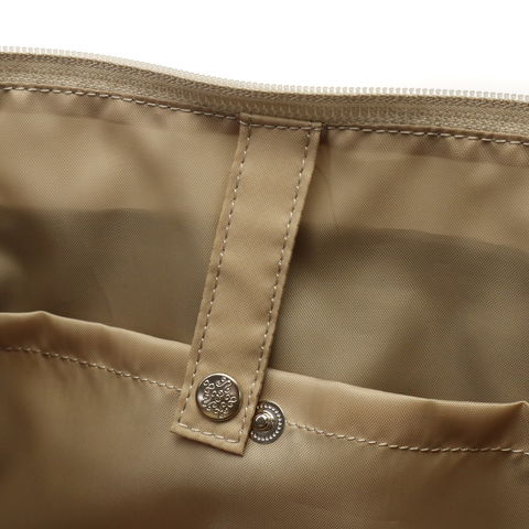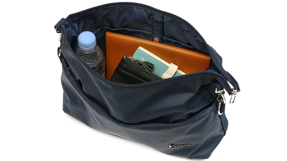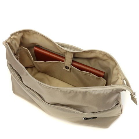 収納部はB5サイズに対応しており、長財布や多少幅のあるポーチなどもしっかり収納可能。大き過ぎず小さすぎない程良いサイズ感が使い勝手抜群です。内部には小物類の管理に配慮した仕分けポケットを豊富に設けているので、バッグの中をすっきり整理整頓することが可能になっています。