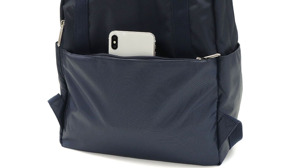 背面には、抗菌・抗ウイルス生地を使用したVIRTECTポケットを備えています。マスクやスマートフォンなど衛生面の気になるアイテムを収納するのにも便利です。(VIRTECTタグが付いている箇所が抗菌・抗ウイルス生地となります。)