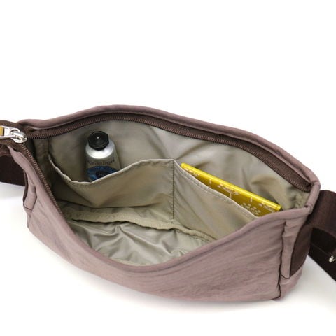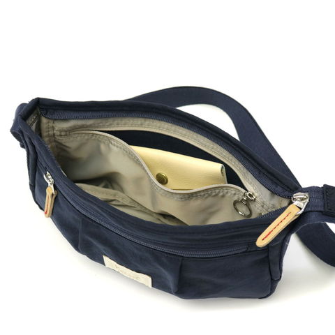 メインルームは、長財布がすっぽりと入る程よいサイズ感。ファスナー付きポケットや小分けポケットも装備しているので、外出時の必需品もスッキリと収納できます。外側のポケットは、スマホなど頻繁に出し入れするアイテムを収納するのに便利。普段使いには勿論、旅行先で身軽に動きたい時も役立ちそうです。