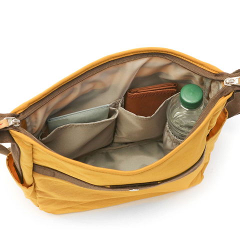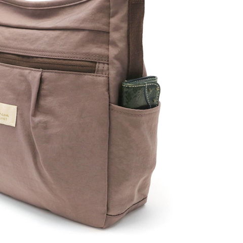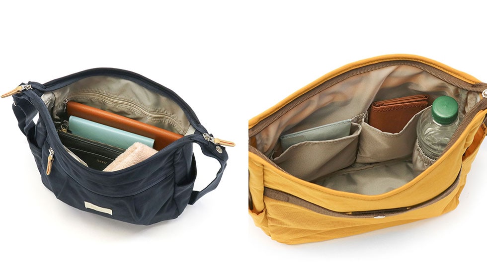 メインルームはB5サイズがすっぽりと収まるサイズ感で、内側には豊富なポケットを備えており、普段使いにも旅行にも便利な機能がたくさん。程よくマチも付いているので必需品もしっかり収納できます。サイドポケットは眼鏡ケースなどちょっとした小物を収納するのに役立ちそうです。