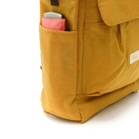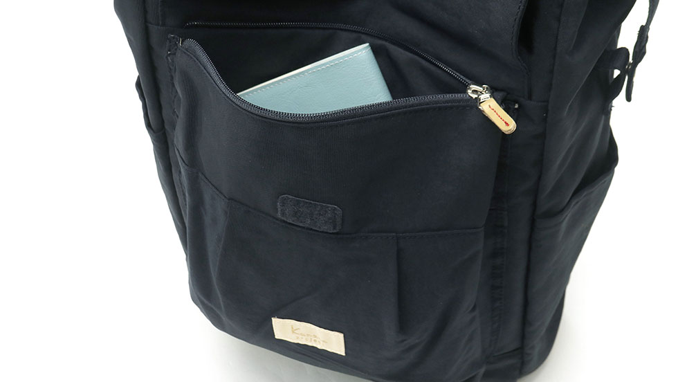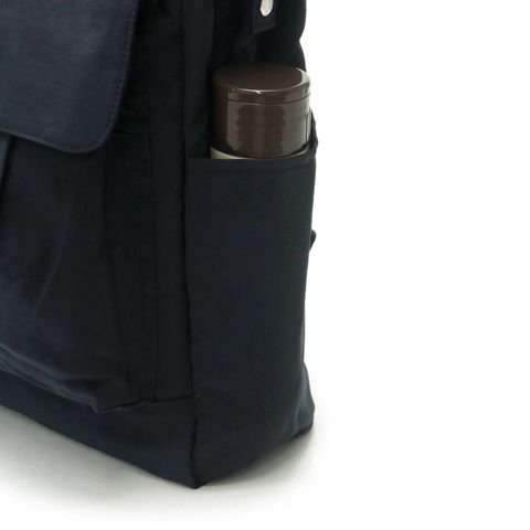 外側正面ポケットはフラップを開くと、さらにジップが備わった2段階アクセスになっているのでICカードなどの大切にしまっておきたい小物類の管理に便利なつくりです。また両サイドにはペットボトルや折りたたみ傘などの収納が可能なポケットが設けられ、使いやすさを考えたデザインになっています。