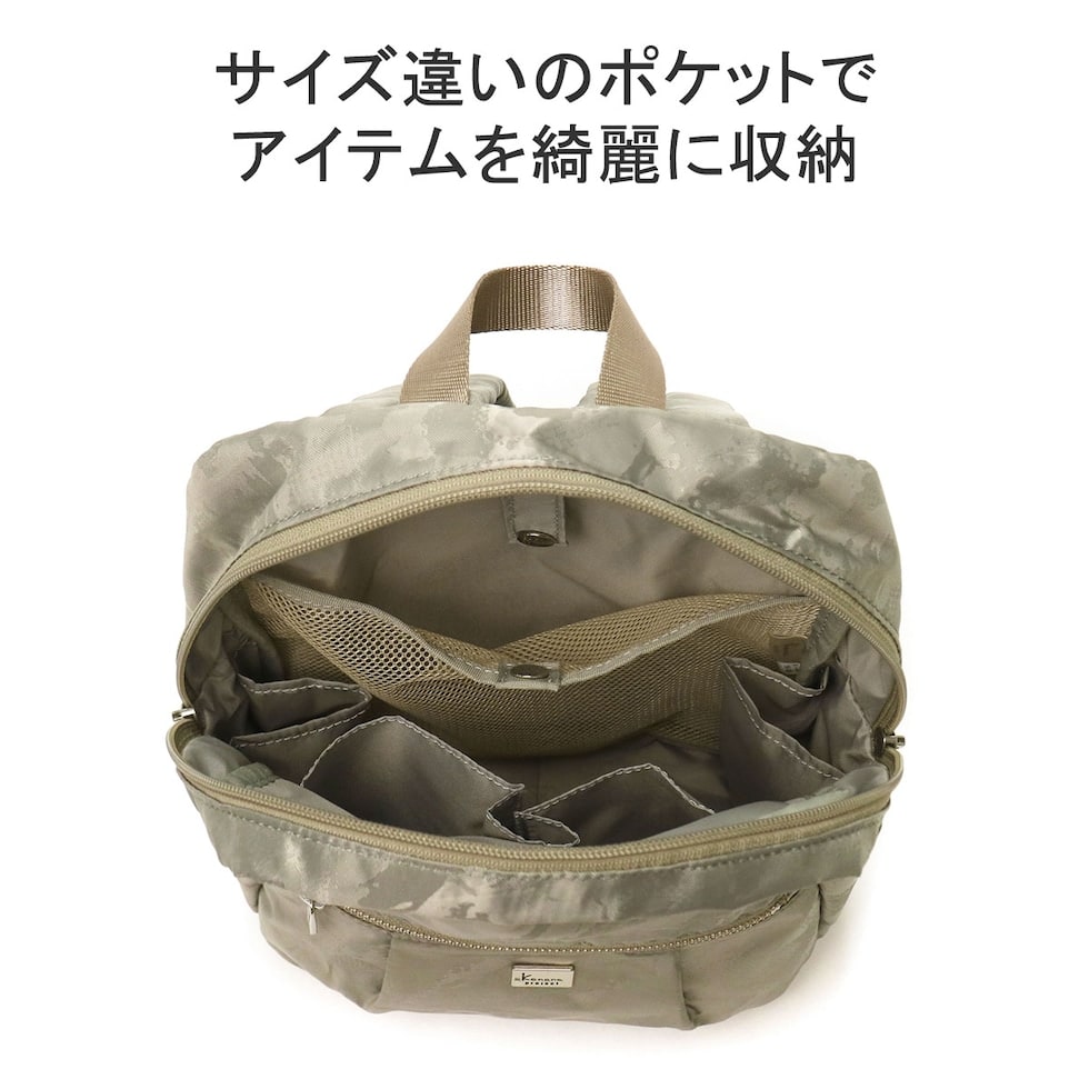 ライトで上品なバッグコレクション『アエリス』から、持ち運びに便利なコンパクトサイズのリュックサックが登場。アクティブなシーンから観劇や美術品などのフォーマルな場所まで使いやすい仕上がりです。大地の木漏れ日から着想された、モザイクパターンのテキスタイルデザインを使用。光の加減で濃淡が揺らぐジャガード生地が、何気ない日々の装いも格上げしてくれます。