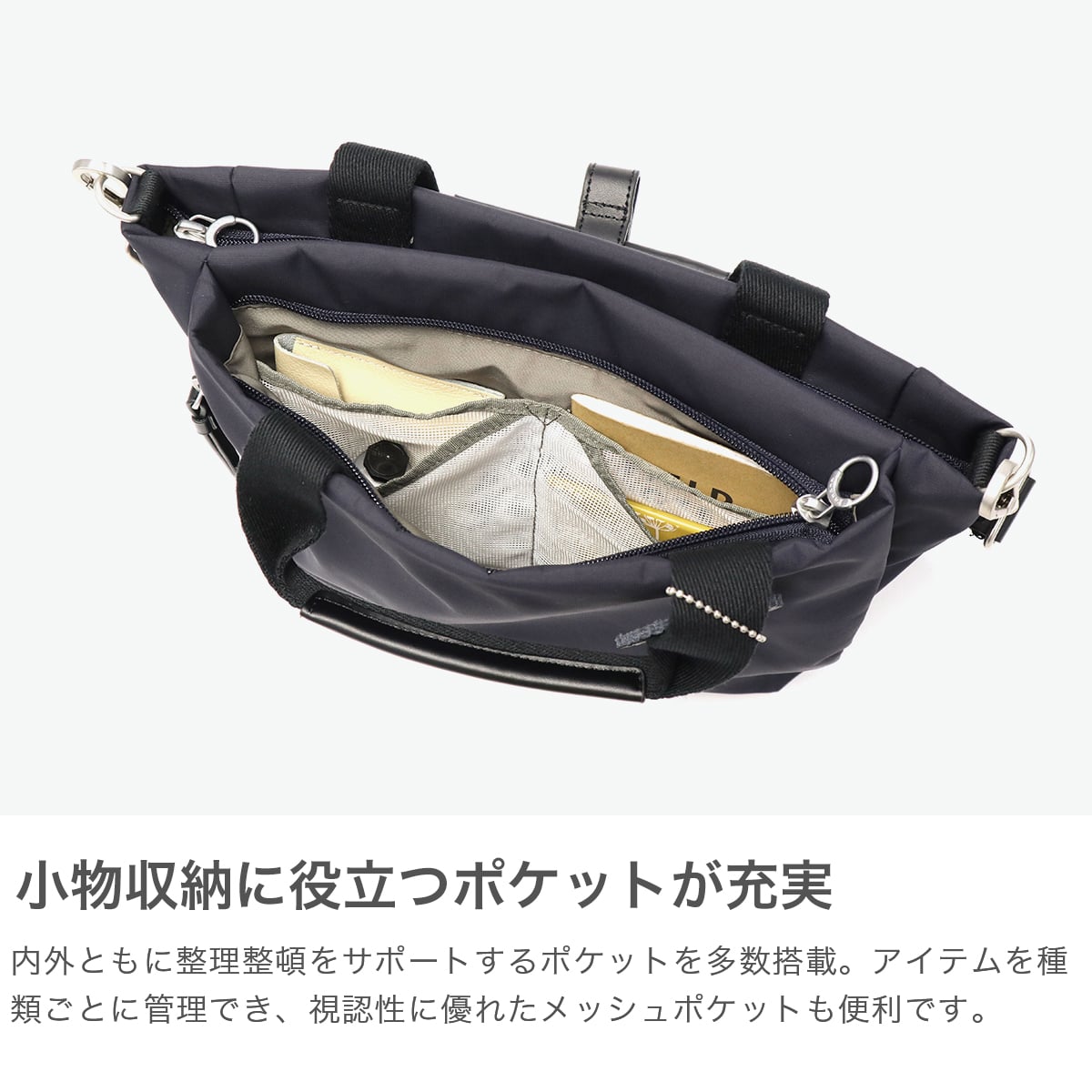 旅行から普段使いまで使える、ミニマルなデザインが特徴的な『サリール2』シリーズの2WAYミニショルダー。収納部は、コンパクトながらも荷物の整理がしやすいよう、ボトルホルダーやファスナー付きポケットなどを備えた機能的な造りに仕上がっています。またショルダーストラップを外して、ミニトートとしても使用できる2WAY仕様もポイント。