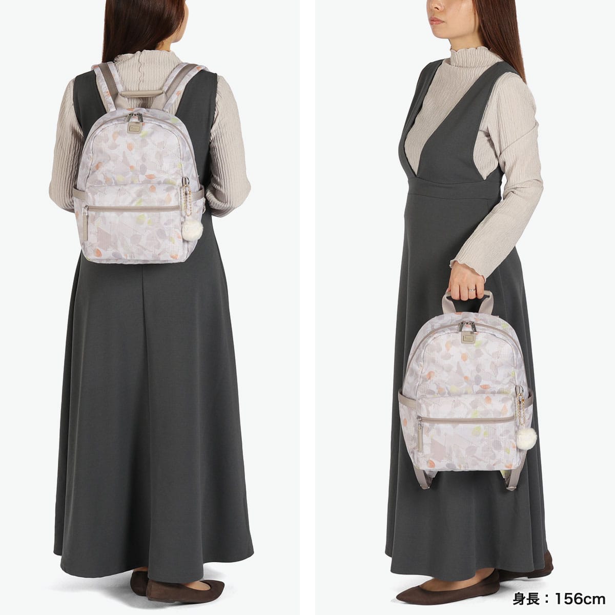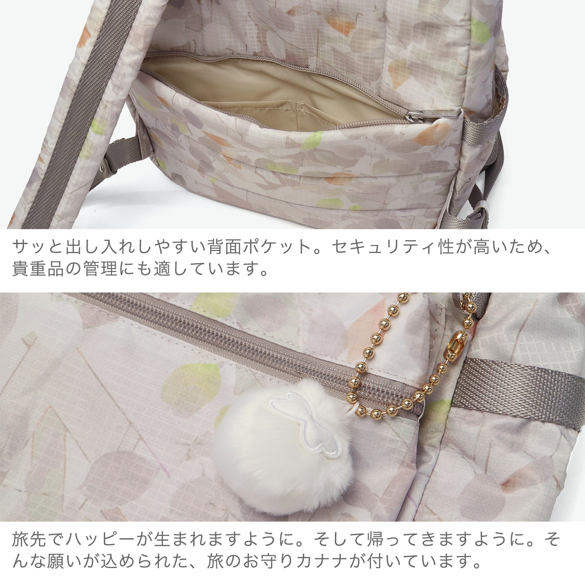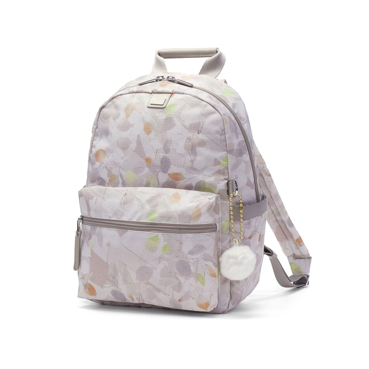 デイリーからトラベルまで幅広く活躍するカジュアルシリーズより、上品な光沢感のある素材を採用した、きれいめスタイルにもなじむリュックサックが登場。B5サイズ対応・13L容量で、通勤やお出かけにちょうどいい使いやすさです。やさしいボタニカル柄が、大人のスタイルにさりげない彩りを添えます。