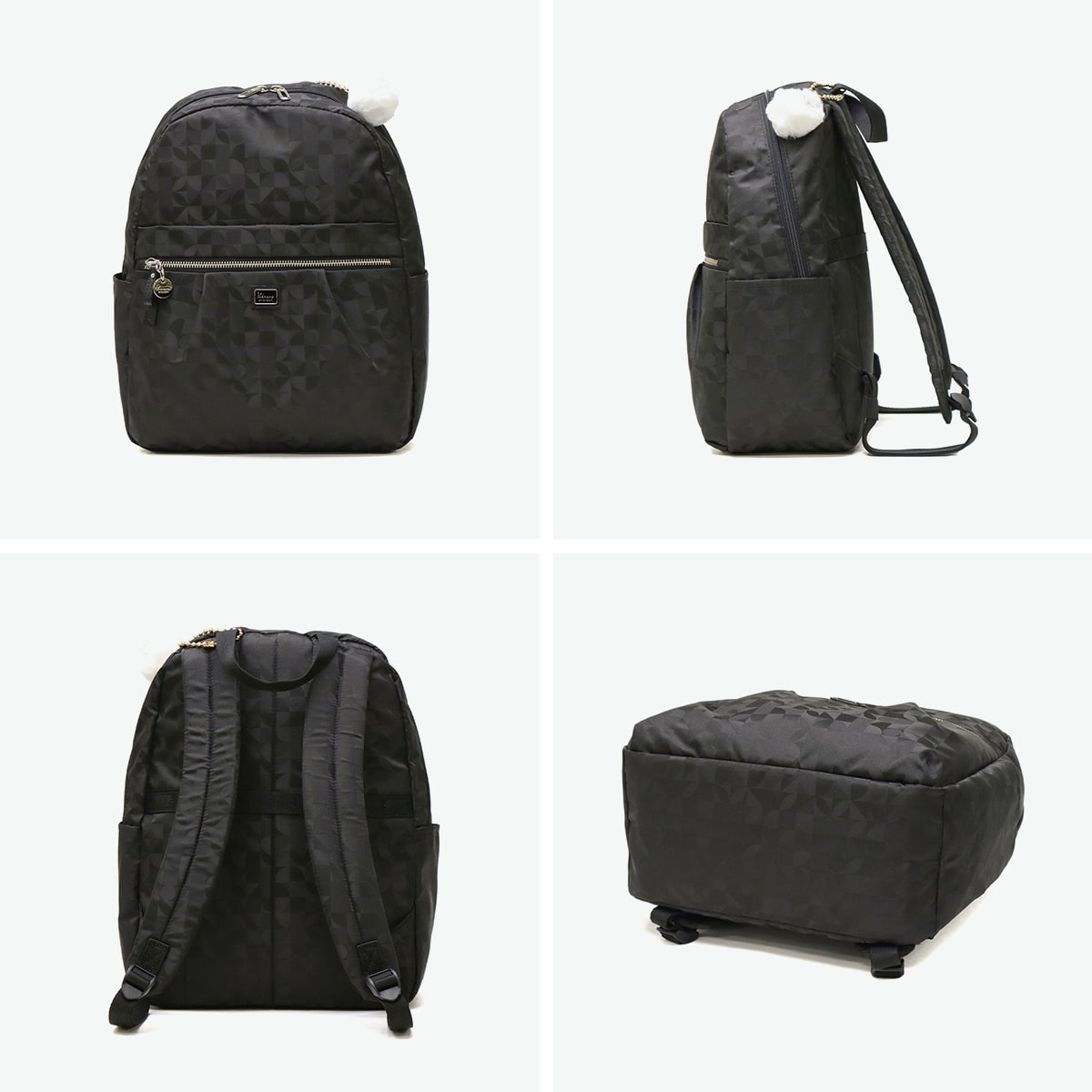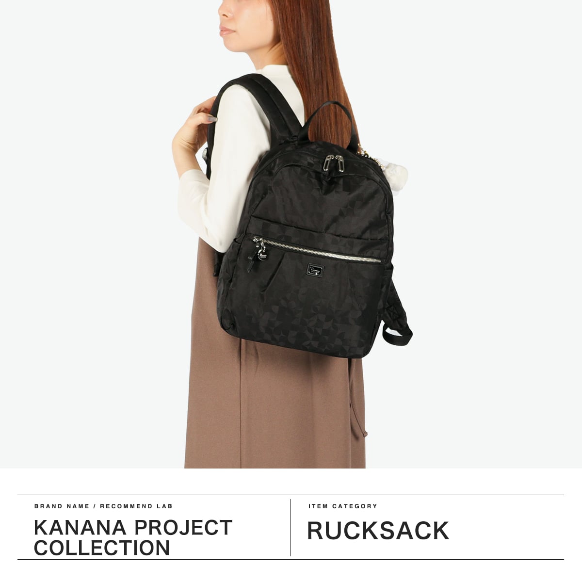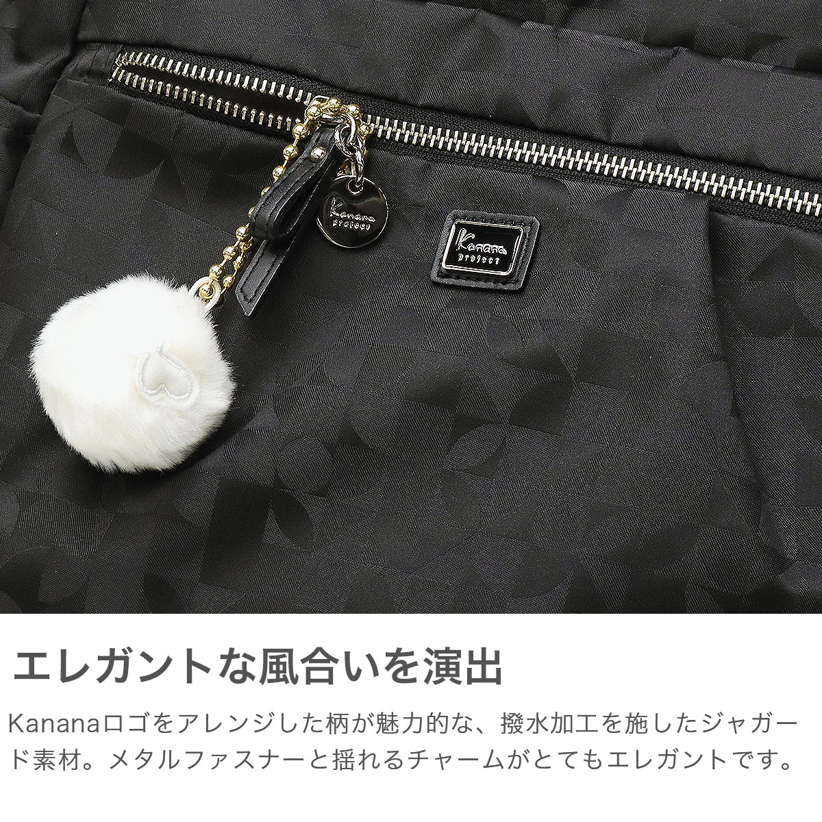 Kananaロゴをオリジナルにアレンジした柄を、上品なジャガード織で仕立てたリュックサック。前ポケットのメタルファスナーと揺れるチャームがとてもエレガントな印象です。軽量でコンパクトな見た目ながら収納力も抜群で、デイリーからトラベルまで幅広く活躍してくれます。