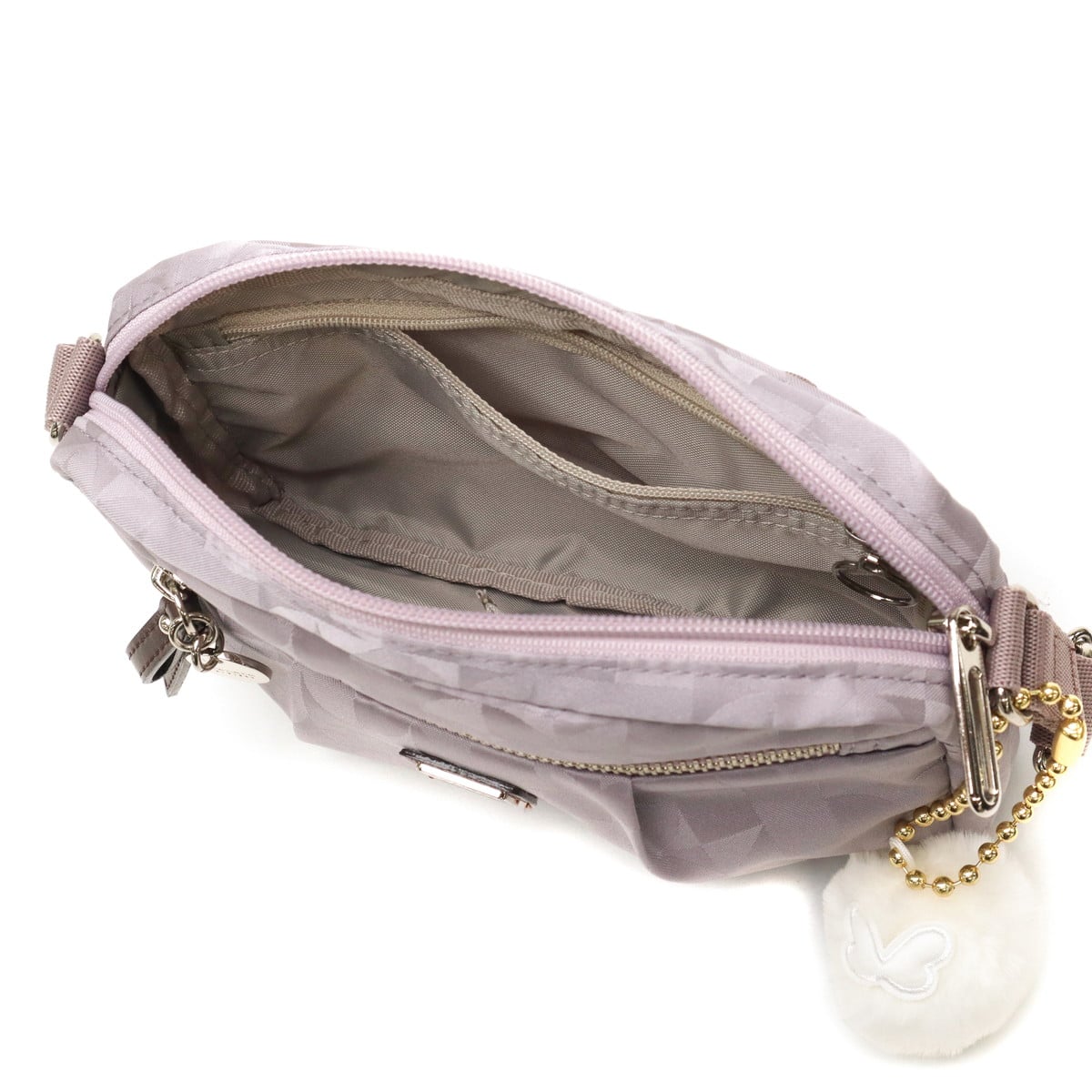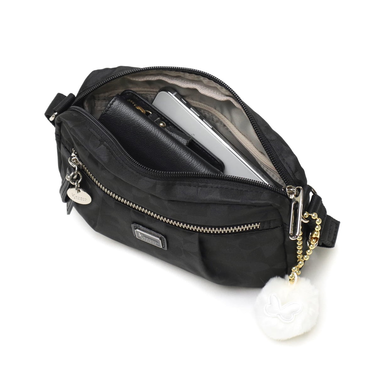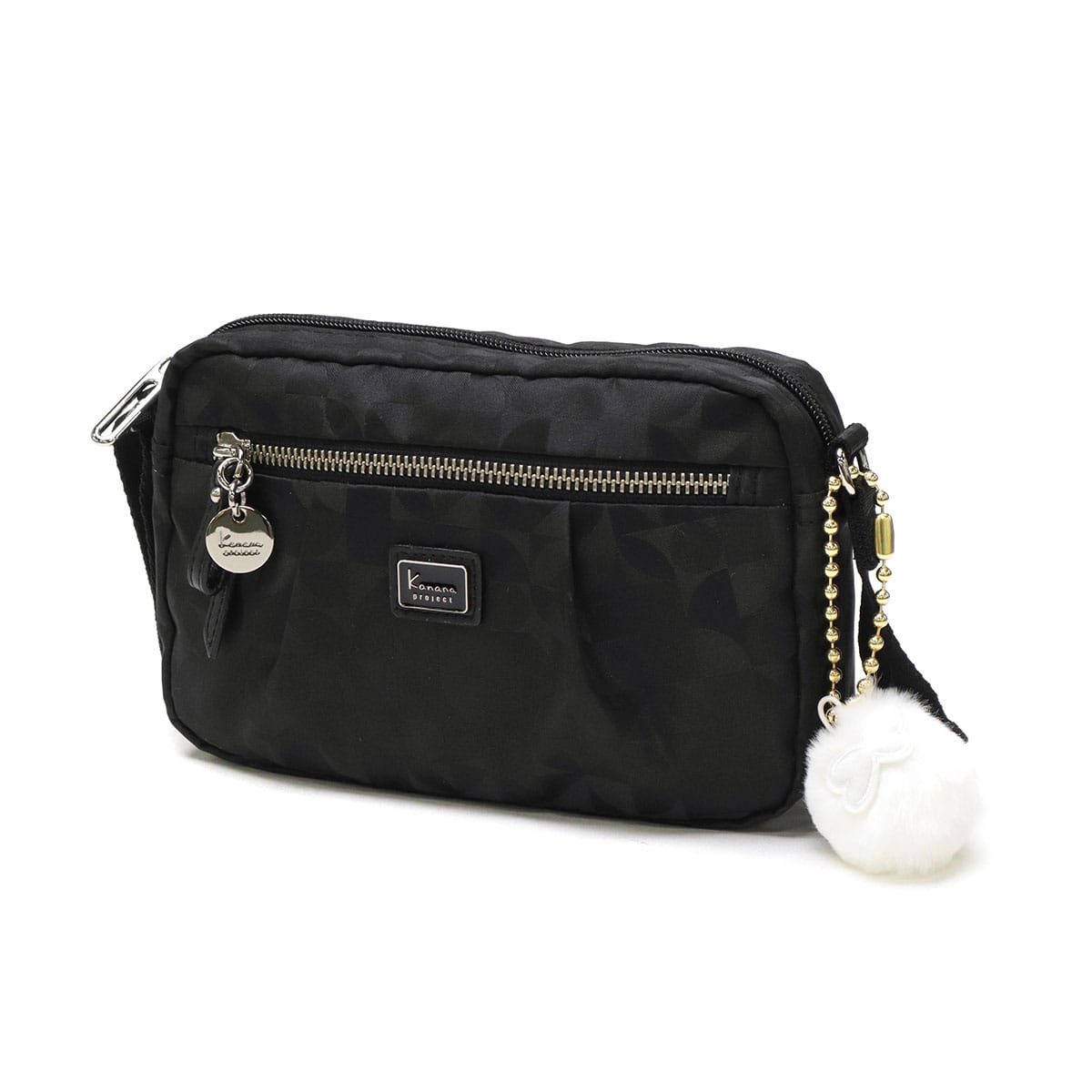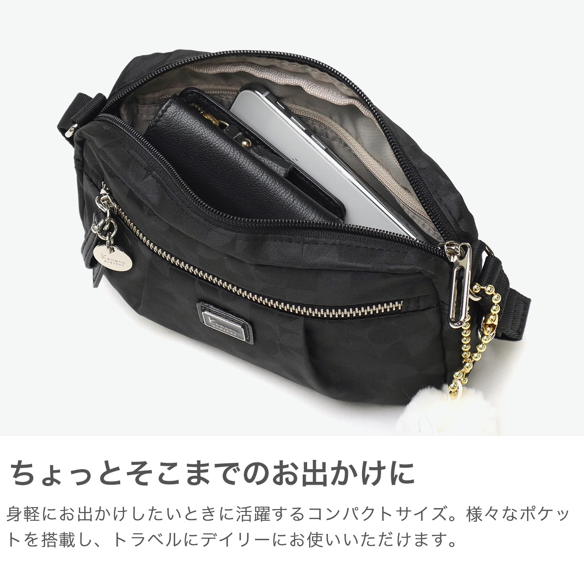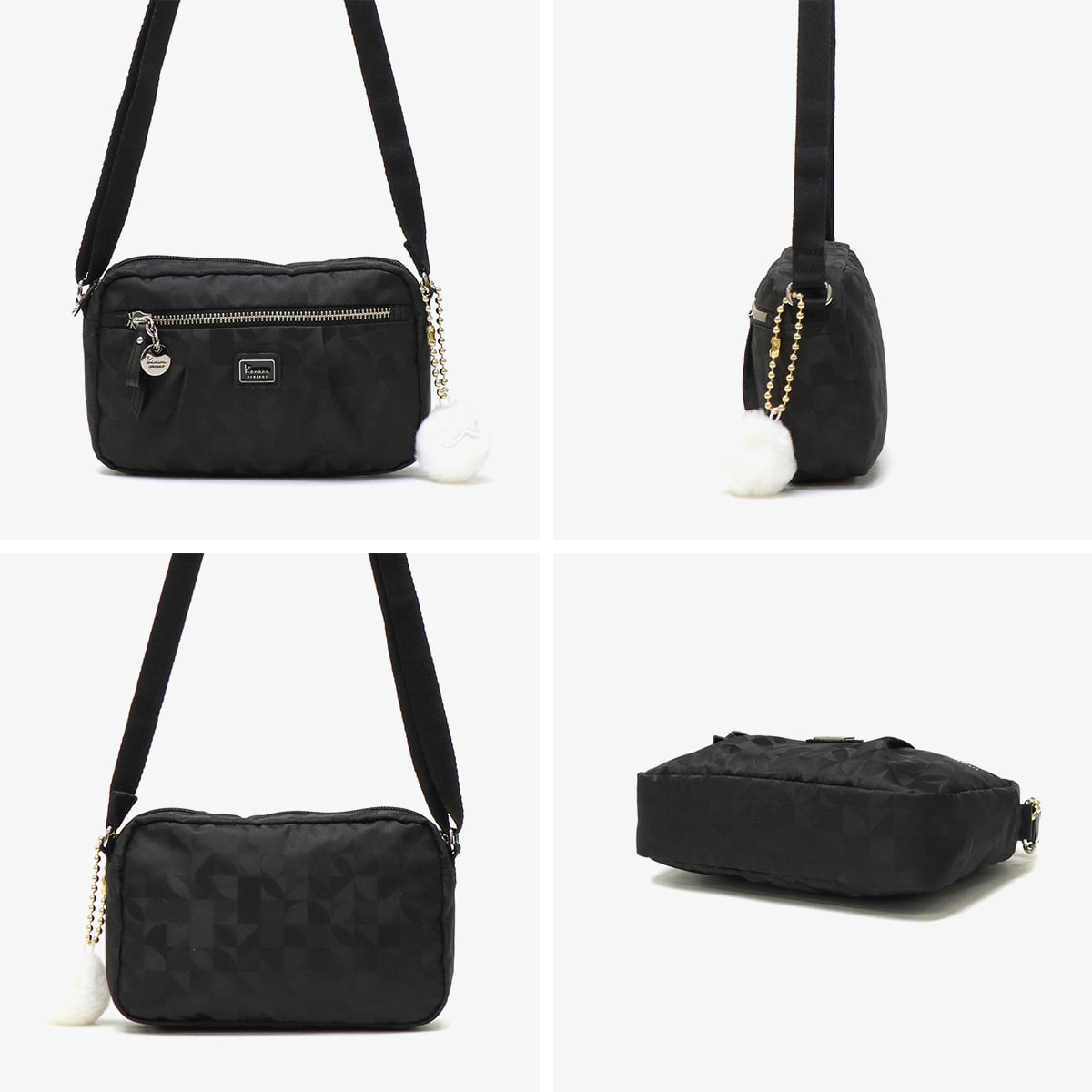 Kananaロゴをオリジナルにアレンジした柄を、上品なジャガード織で仕立てたショルダーバッグ。前ポケットのメタルファスナーと揺れるチャームがとてもエレガントな印象です。様々なポケットを搭載し、デイリーからトラベルまでフレキシブルにお使いいただけます。