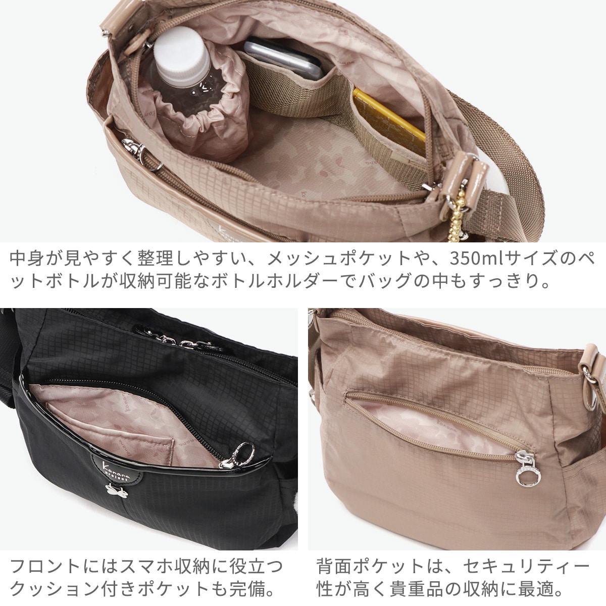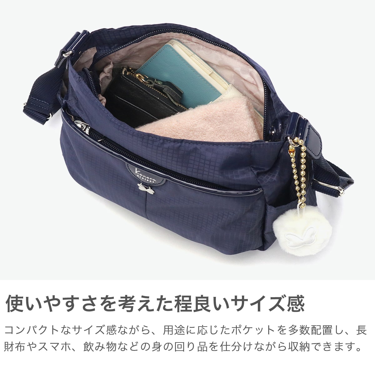 スタイリングのポイントにもなる少し丸みを帯びた可愛らしいデザインと、デイリーからトラベルまで幅広く活躍する機能性を兼ね備えた『シェリ』シリーズ。こちらは4L容量のミニショルダーバッグです。コンパクトなサイズ感ながら、長財布やスマホなどお出かけの際の必需品をしっかり収納できます。