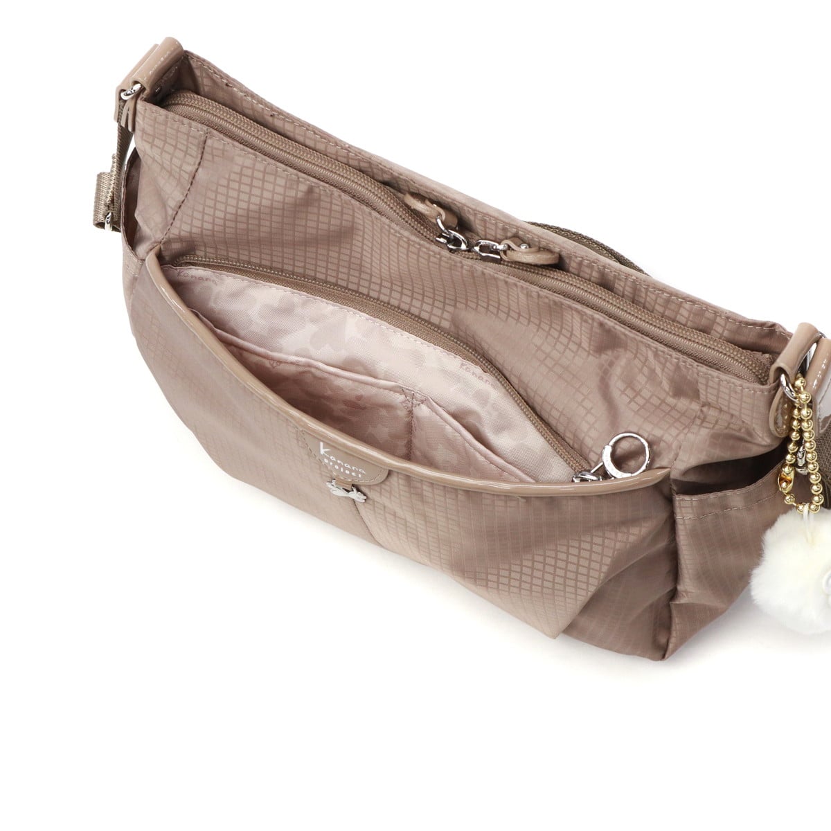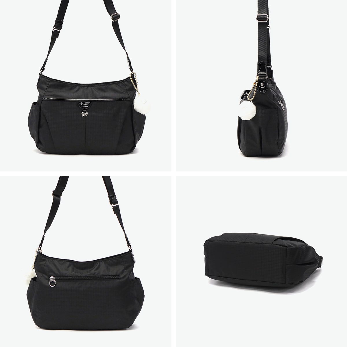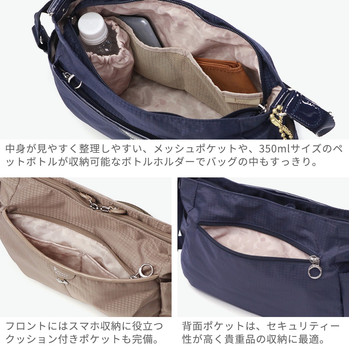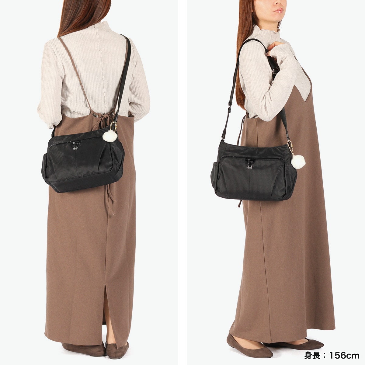 スタイリングのポイントにもなる少し丸みを帯びた可愛らしいデザインと、デイリーからトラベルまで幅広く活躍する機能性を兼ね備えた『シェリ』シリーズ。こちらは6L容量のショルダーバッグです。長財布やスマホなどの身の回りのものを余裕をもって収納できるサイズ感です。