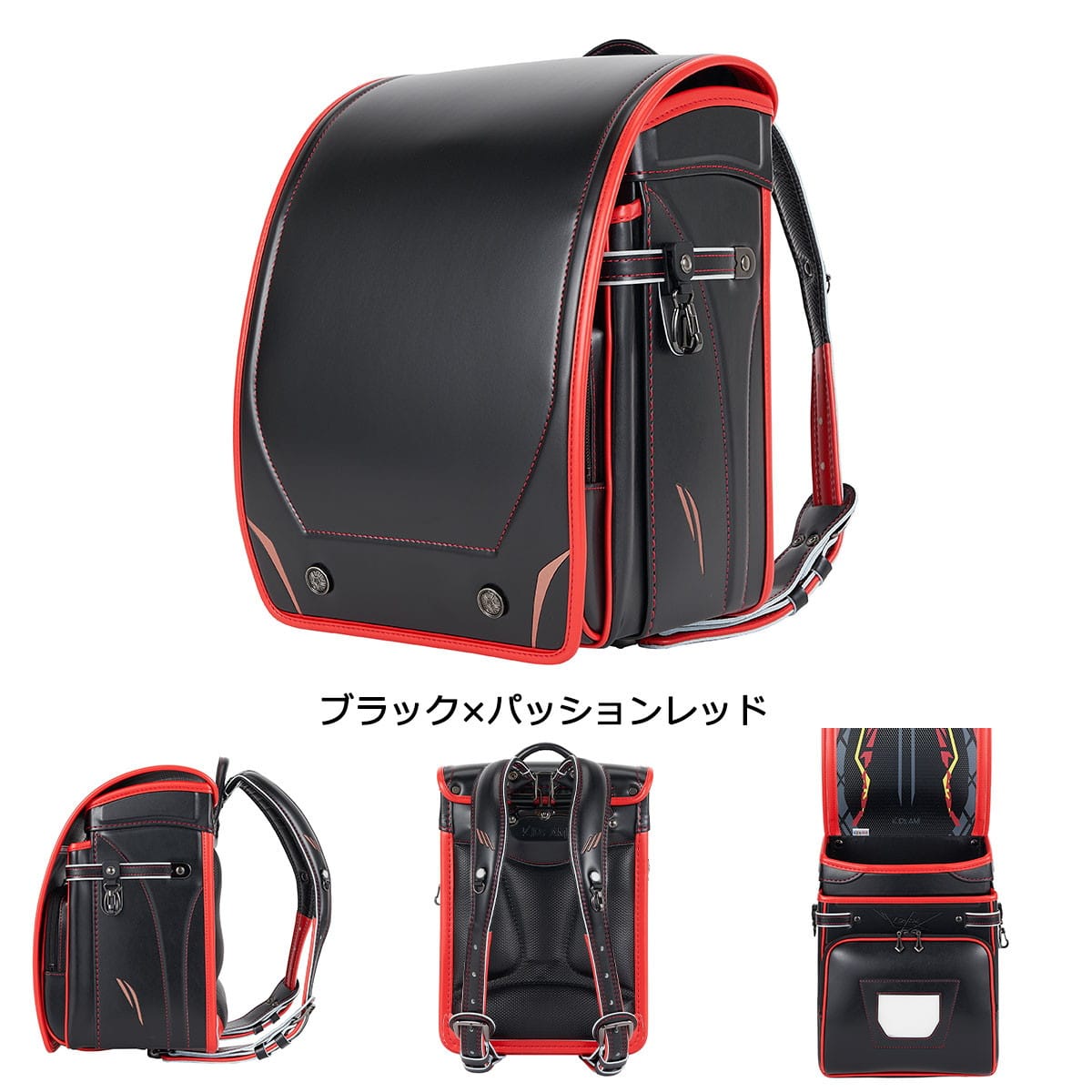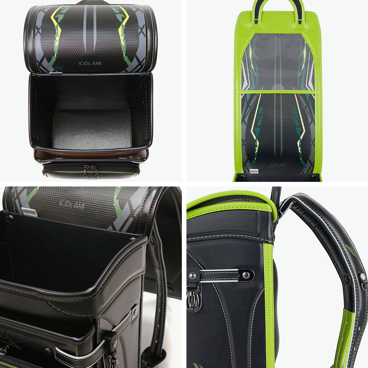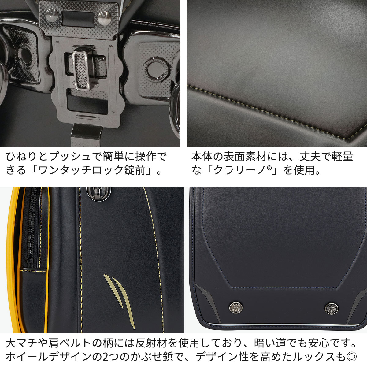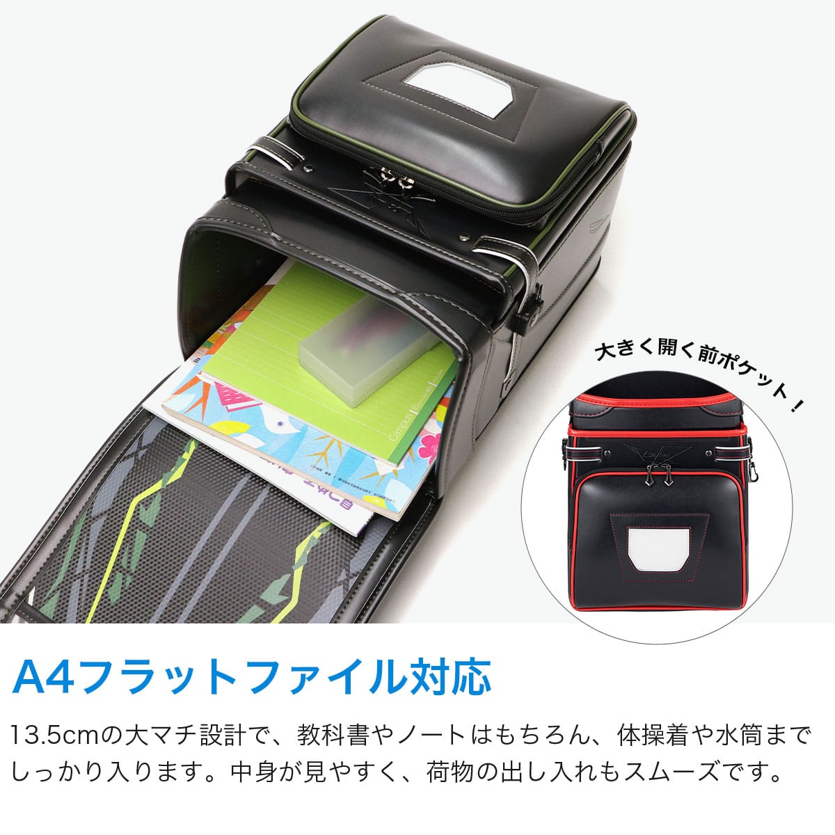 大容量13.5マチのフラットキューブ型ランドセル。体操着や水筒まで収納できるA4対応サイズでありながら、すっきりとした見た目に仕上がっています。さらに背カンや肩ベルトは、重さ・衝撃を軽減する構造に。毎日背負う身体への負担を減らしてくれます。外装デザインは、バイクやライダースーツをモチーフにした色鮮やかで洗練されたアクティブなイメージに。また、内装のビビッカラーやカーボン柄をあしらったアクティブなデザインもポイントです。