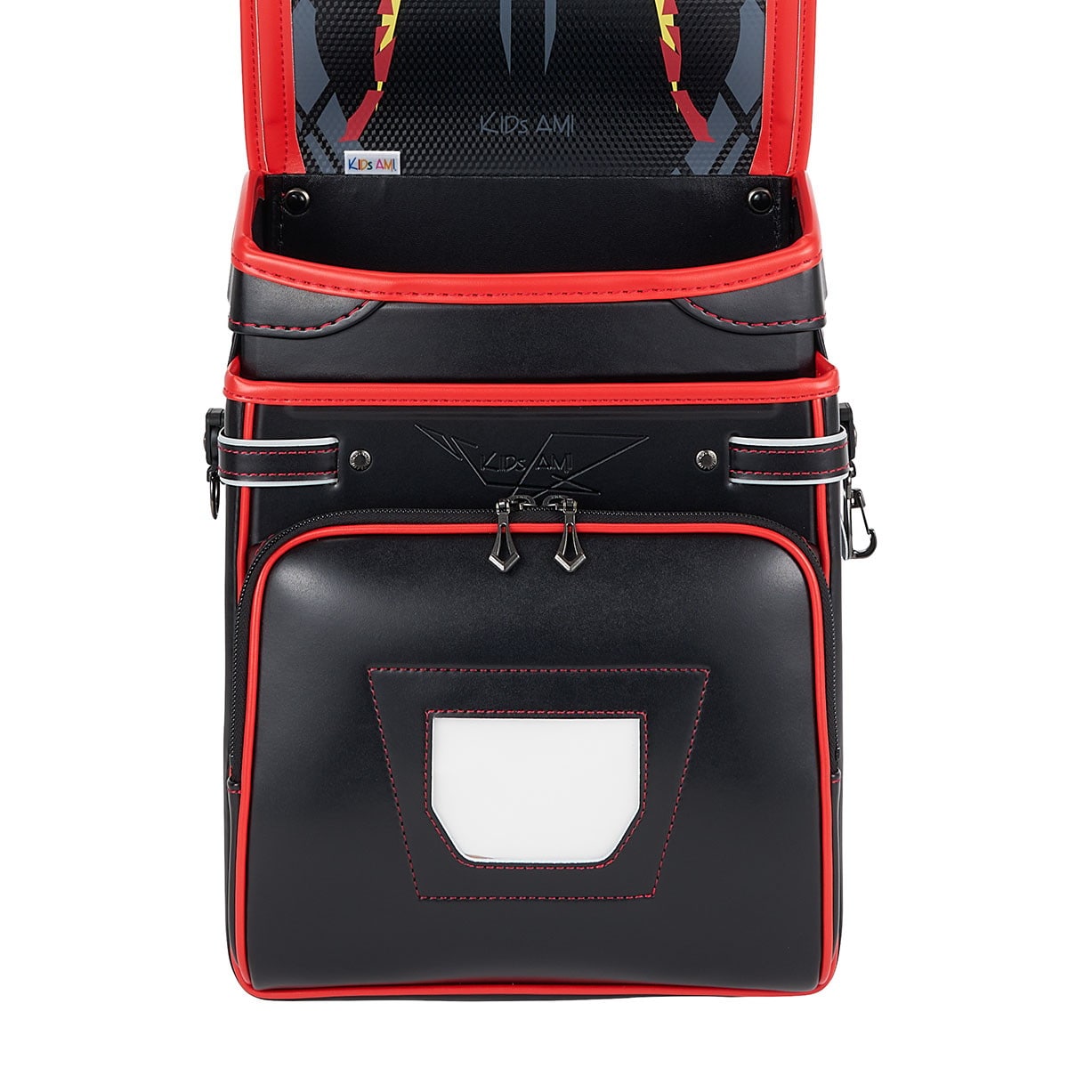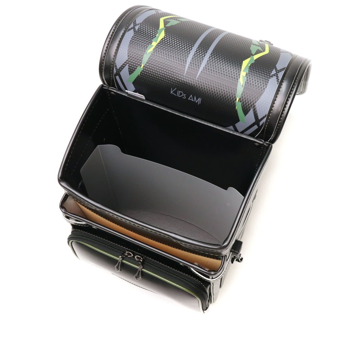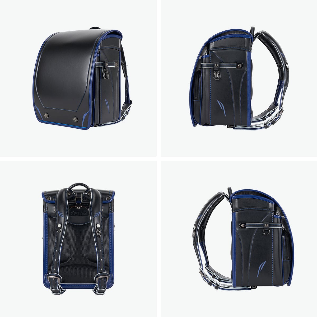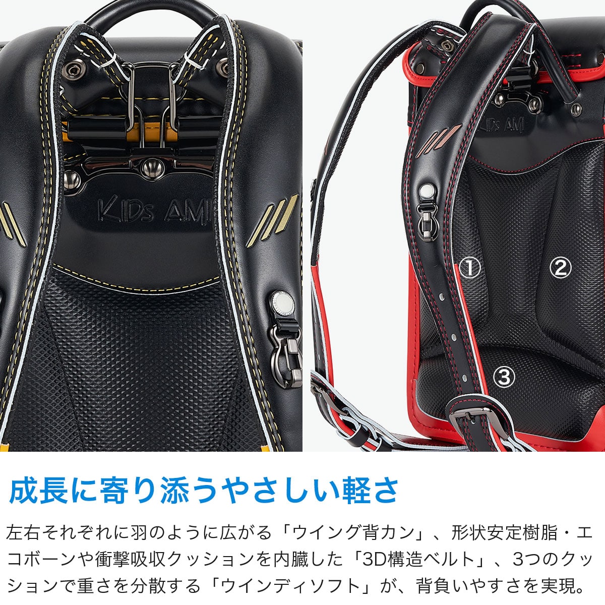 大容量13.5マチのフラットキューブ型ランドセル。体操着や水筒まで収納できるA4対応サイズでありながら、すっきりとした見た目に仕上がっています。さらに背カンや肩ベルトは、重さ・衝撃を軽減する構造に。毎日背負う身体への負担を減らしてくれます。外装デザインは、バイクやライダースーツをモチーフにした色鮮やかで洗練されたアクティブなイメージに。また、内装のビビッカラーやカーボン柄をあしらったアクティブなデザインもポイントです。