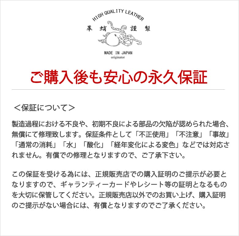 ※天然皮革を使用する製品のほとんどが、天然皮革ならではの風合いを生かして作られているため、表面にキズ・色ムラ・シワがある場合がございます。特性上、革の表面にはキズ・色ムラ・シワなどがございますが、良品となりますので予めご了承ください。※水濡れ(雨・汗など)や日焼けによる色落ち、退色は避けられませんので、夏季、雨天でのご使用、また淡い色の服装に合わせる場合は十分にご注意ください。※使用しているアルミファスナーは素材の性質上、ファスナーの開閉によってアルミの粉が生地を汚す場合がございます。また、はじめはファスナーに引っ掛かりを感じる場合がございますが、使用回数によって軽減されます。ファスナーの特性として、ご了承ください。※極力実物に近い色味を再現しておりますが、モニター等の条件により画面上と実物では色味が異なって見える場合がございます。
