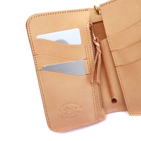 分厚い革と重厚感のあるしっかりしたつくりが魅力的な『革蛸オリジネーター』の二つ折り財布。使っていくうちに柔らかく馴染んでいき、色濃く変化していく、育てがいのあるずっしりした厚みが最大の魅力です。ウォレットチェーンが装着できる真鋳製のカンも備わり、アメカジテイストに仕上がっています。