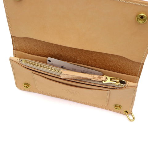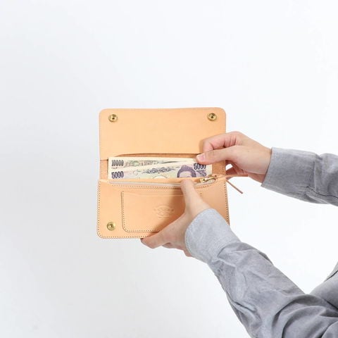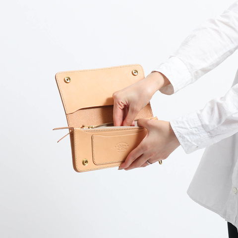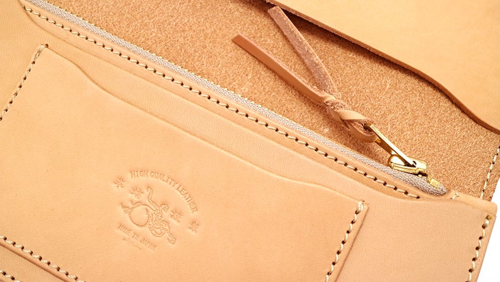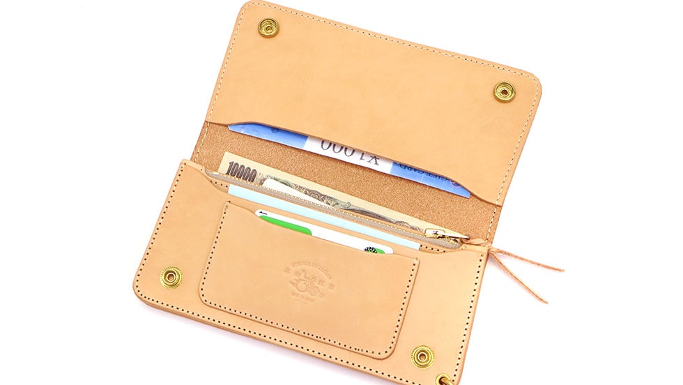 収納部は札入れをひとつ設けたシンプルな設計で、ファスナータイプの小銭入れを備えています。大きさの異なるフリーポケットは、領収書やチケットの収納に最適なスペース。また一番手前には、ブランドロゴがあしらわれたカードポケットが備わっています。