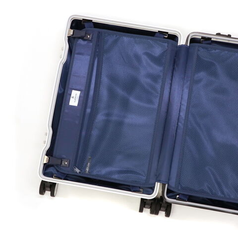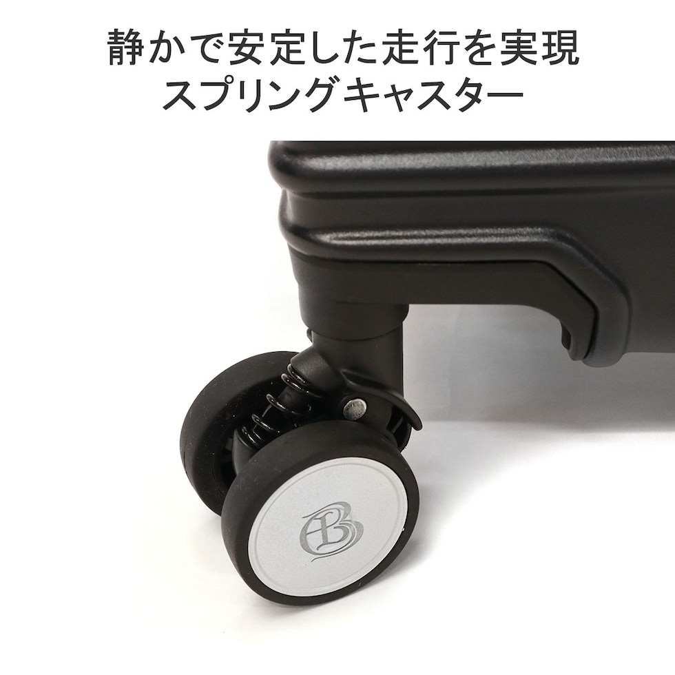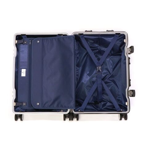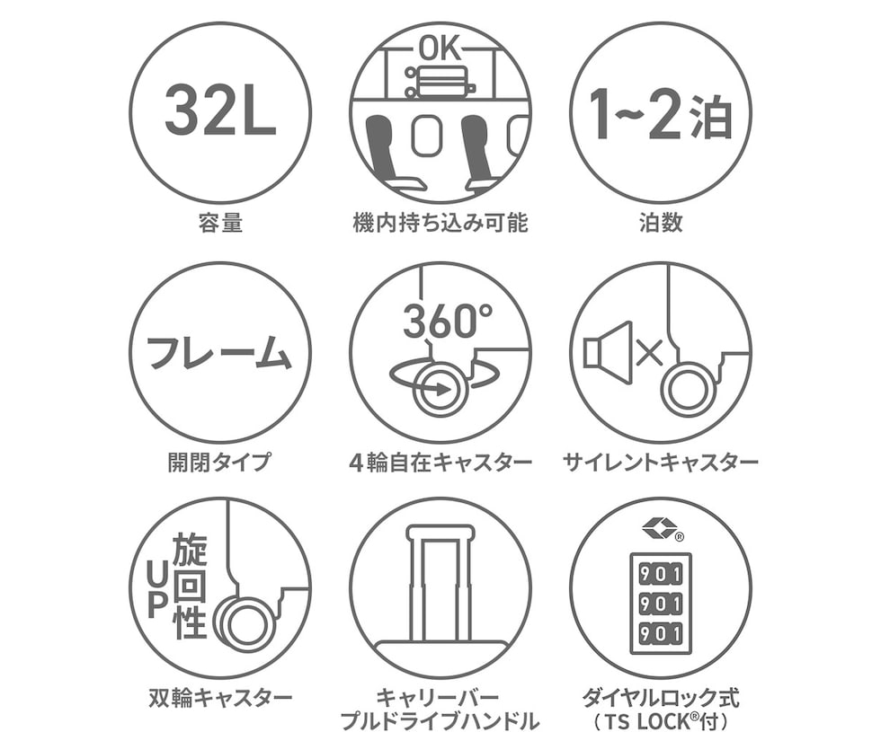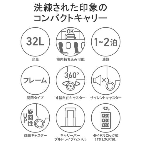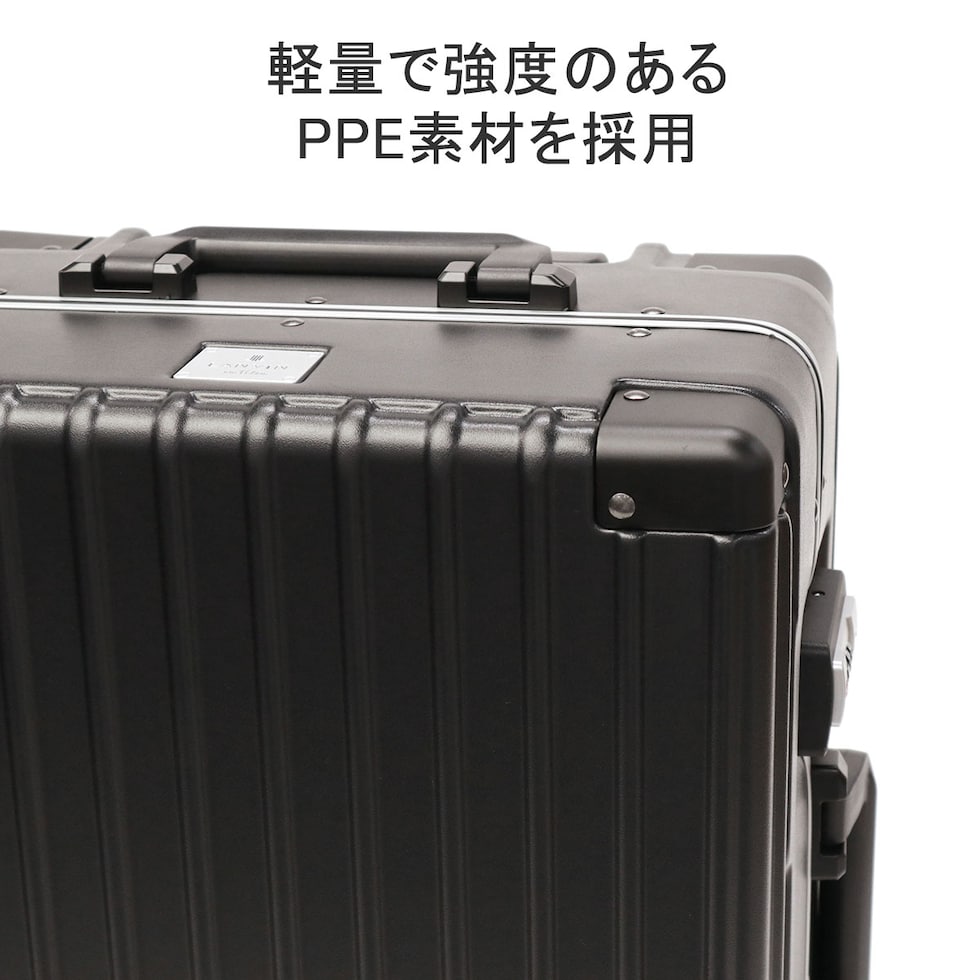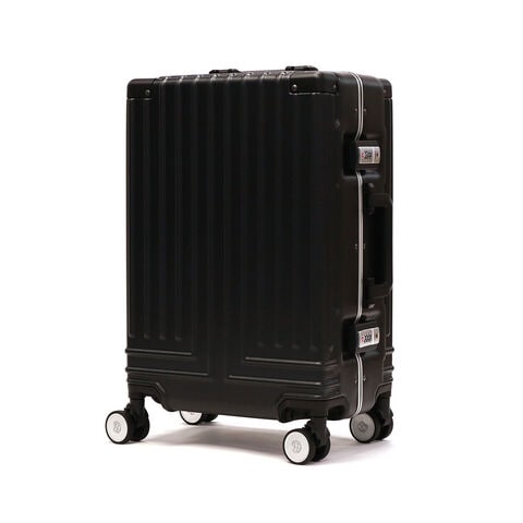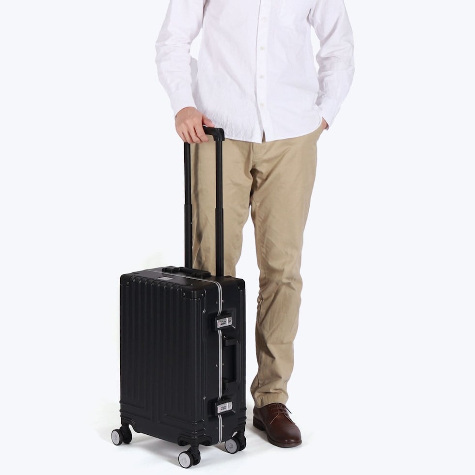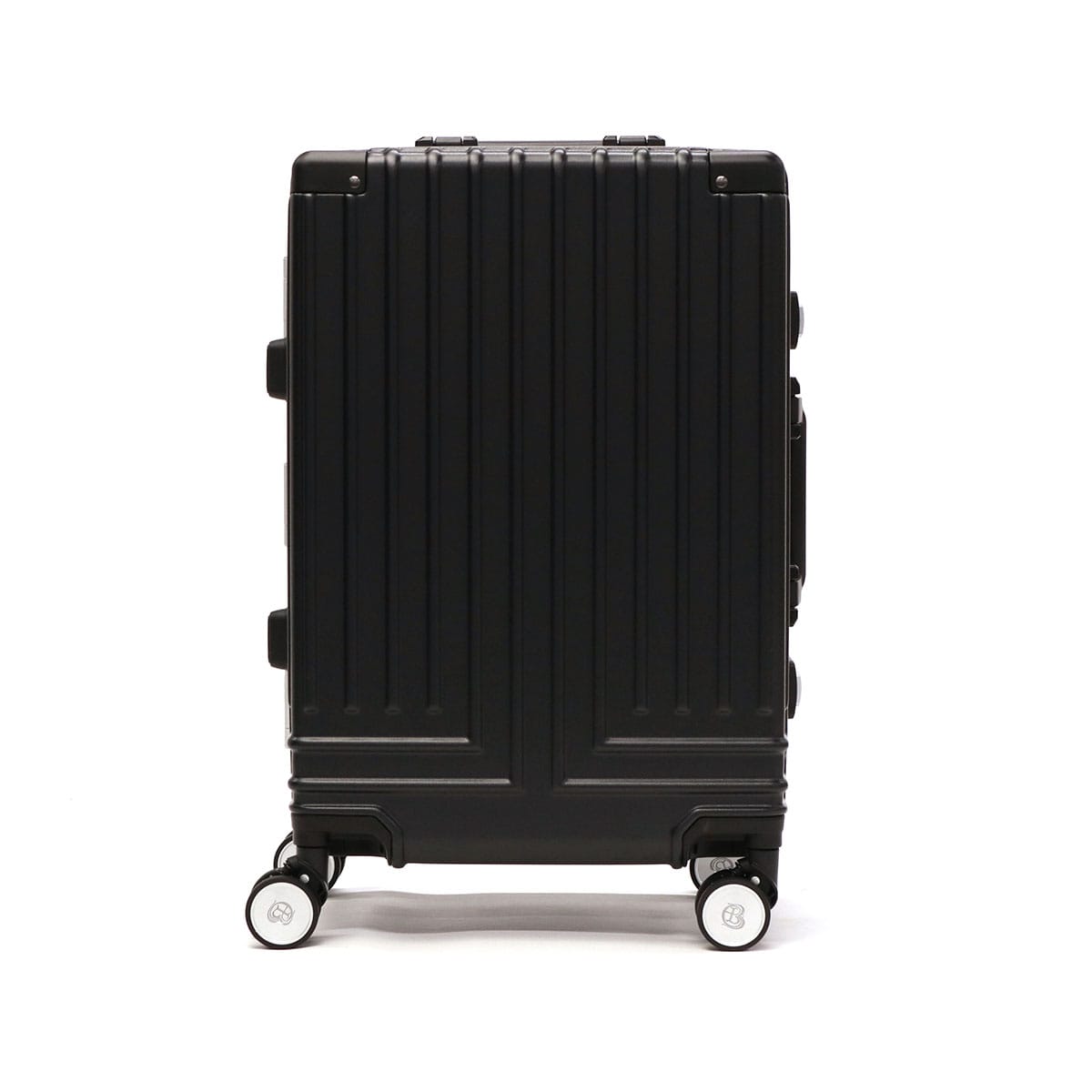 ブランドアイコンを全体に施し、スタイリッシュな印象を与えるフレームタイプのキャリーケース。こちらは、持ち込み可能サイズです。軽量で丈夫なPPE素材と強度を高めるアルミフレームを採用。3段階調整キャリーバーや、360°回転キャスターを搭載し、快適な移動をサポートします。