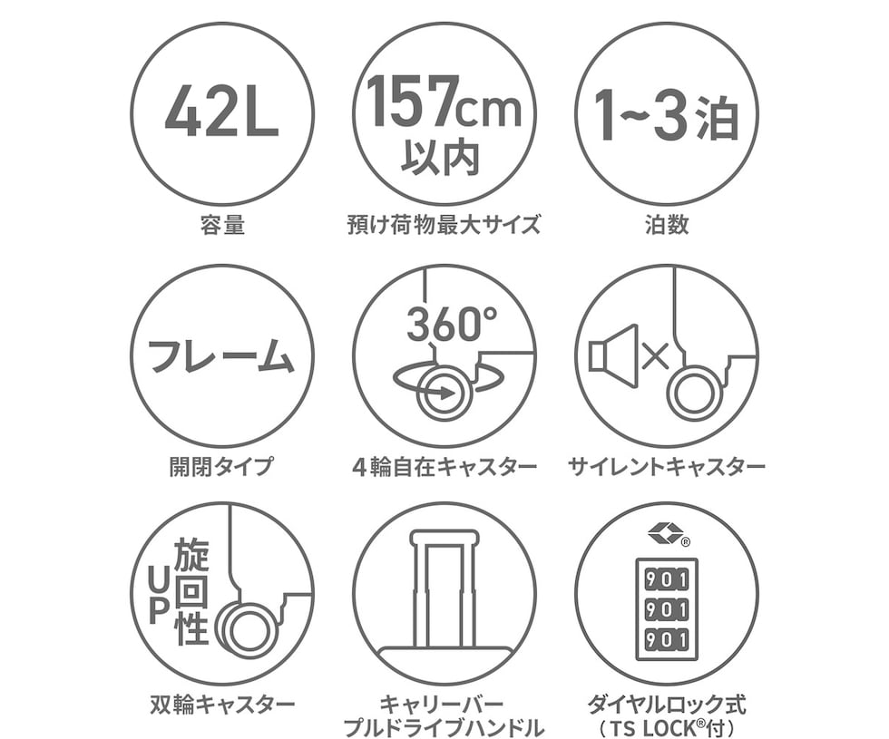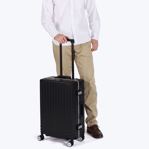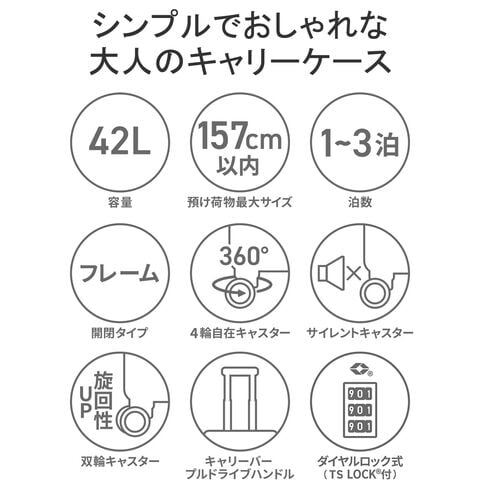 ブランドアイコンを全体に施し、スタイリッシュな印象を与えるフレームタイプのキャリーケース。こちらは、1?3泊の旅行に最適なサイズです。軽量で丈夫なPPE素材と強度を高めるアルミフレームを採用。3段階調整キャリーバーや、360°回転キャスターを搭載し、快適な移動をサポートします。