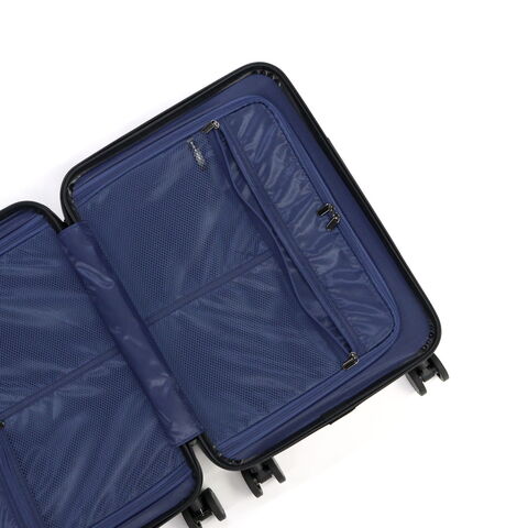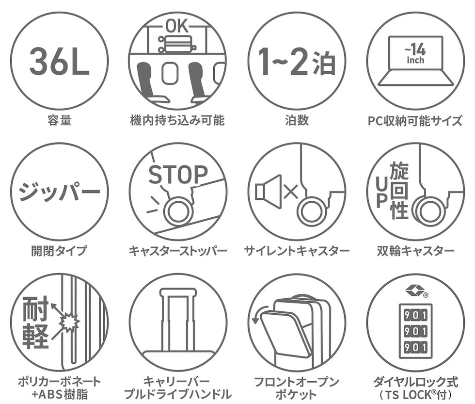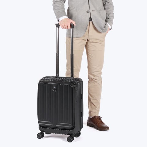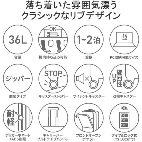 ブランドのアイコンが全体に施され、スタイリッシュな印象を与える機内持ち込みサイズのキャリーケース。フロントポケットからメインルームにアクセスできる設計で、スーツケースを立てたまま荷物が取り出せます。キャリーバーや、360°回転キャスター、ストッパー機能を搭載し、軽量で丈夫な強い素材が使用され、使い勝手抜群。ツヤ感を抑えたマット調仕上げで大人っぽい落ち着いた雰囲気が魅力です。