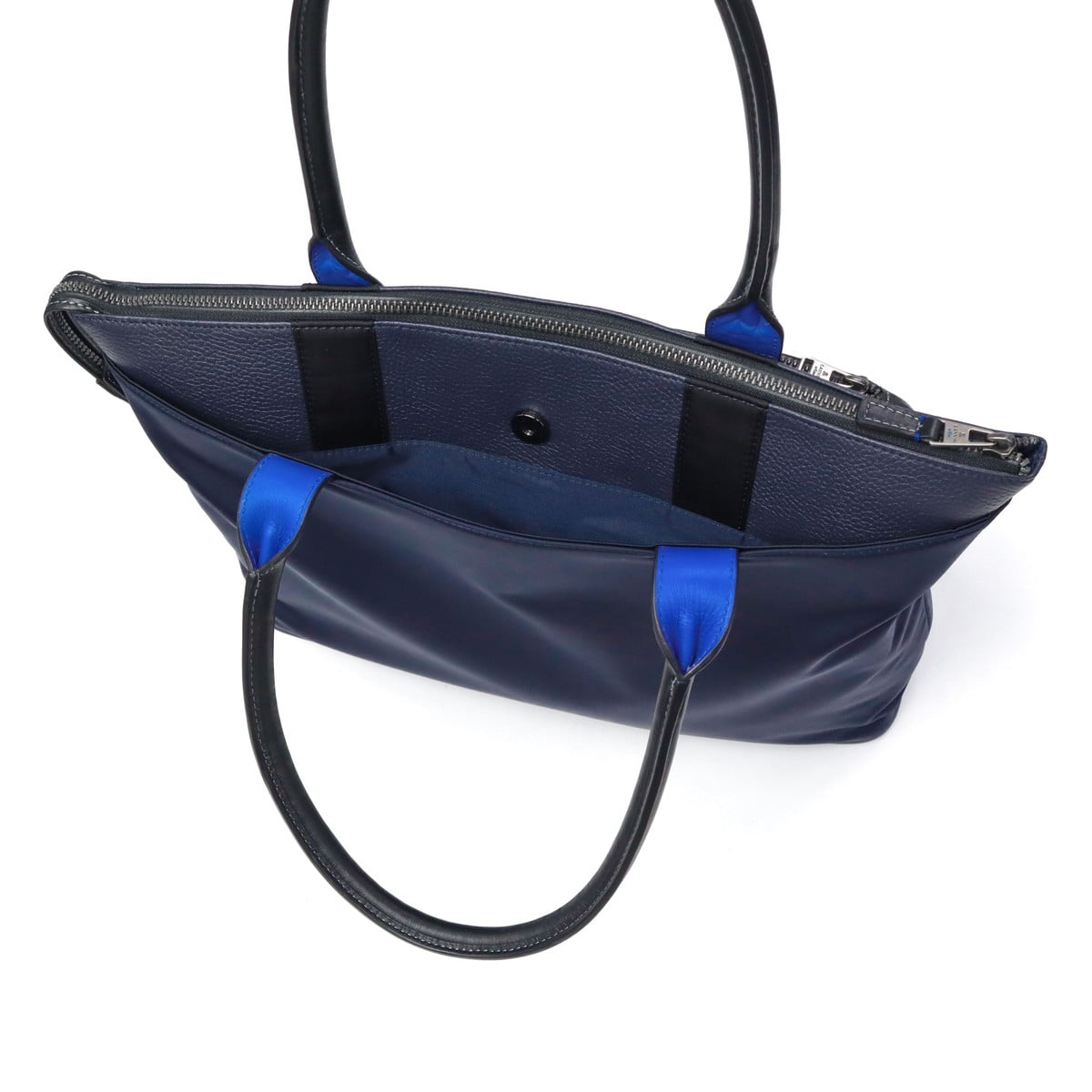 レザーの分量感がポイントの上品なテイストのカジュアルシリーズ『レイト』のトートバッグです。上質なシュリンクレザーに、スムースレザーと高級ナイロンを組み合わせた、ブランドらしい異素材ミックスが魅力です。あえてレザーを引き立て役に、生地を主役にした独自の素材使いも印象的。フロントにはファスナー付きとベタポケットの2層ポケットを備え、デザイン性と機能性を両立させた仕上がりです。