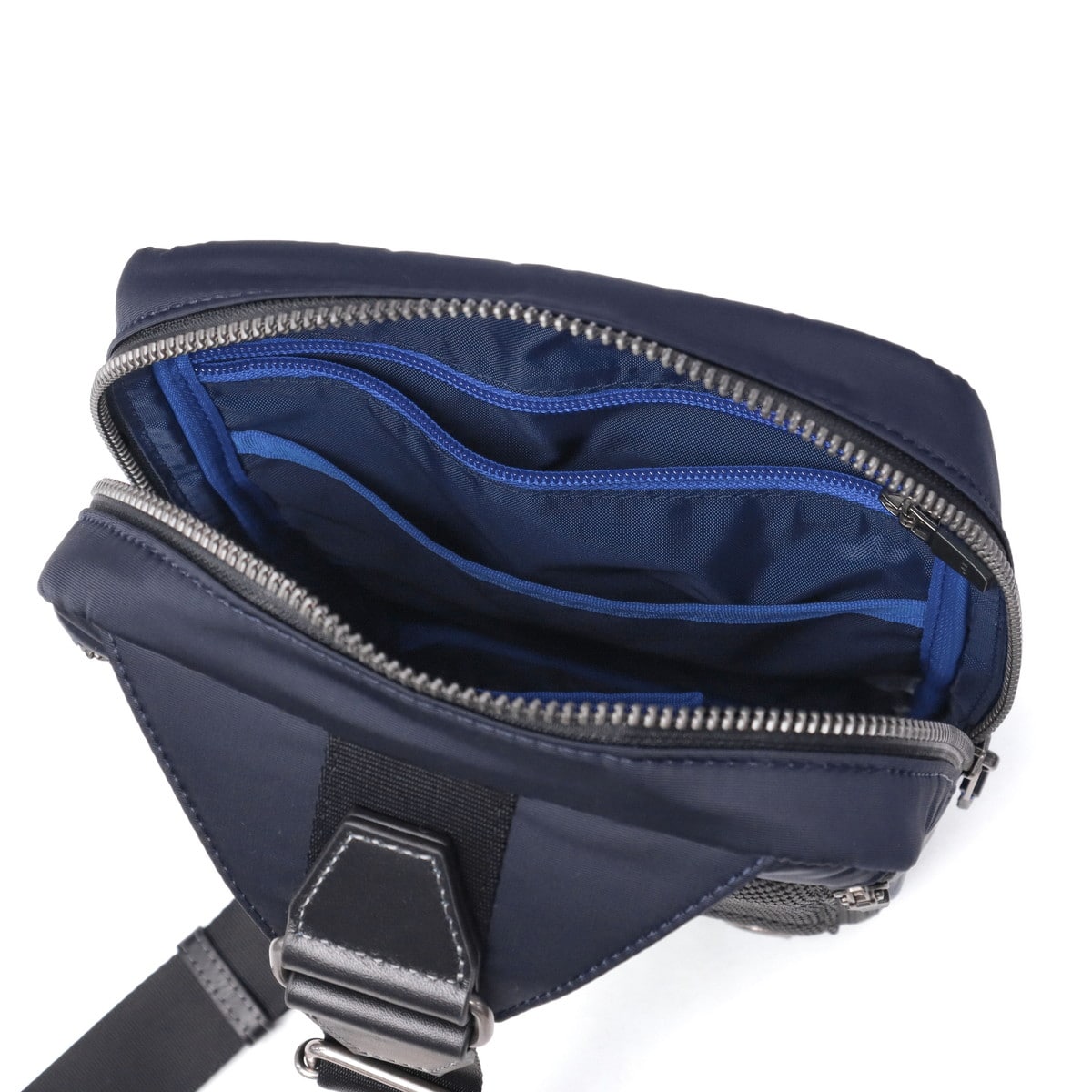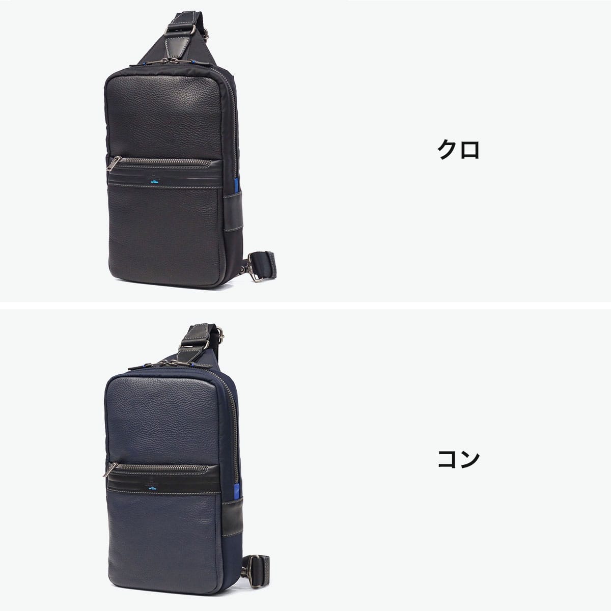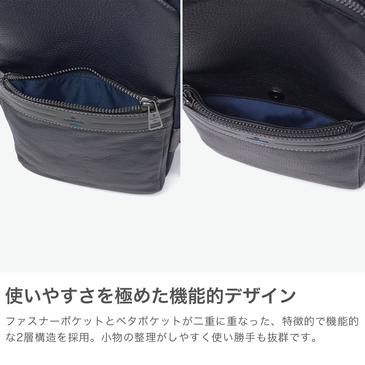 レザーの分量感がポイントの上品なテイストのカジュアルシリーズ『レイト』のボディバッグです。上質なシュリンクレザーに、スムースレザーと高級ナイロンを組み合わせた、ブランドらしい異素材ミックスが魅力です。あえてレザーを引き立て役に、生地を主役にした独自の素材使いも印象的。フロントにはファスナー付きとベタポケットの2層ポケットを備え、デザイン性と機能性を両立させた仕上がりです。
