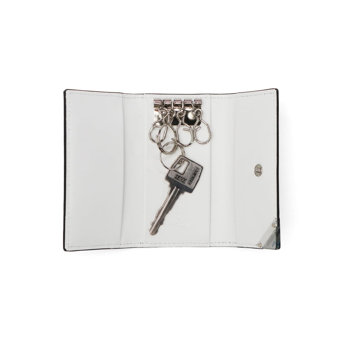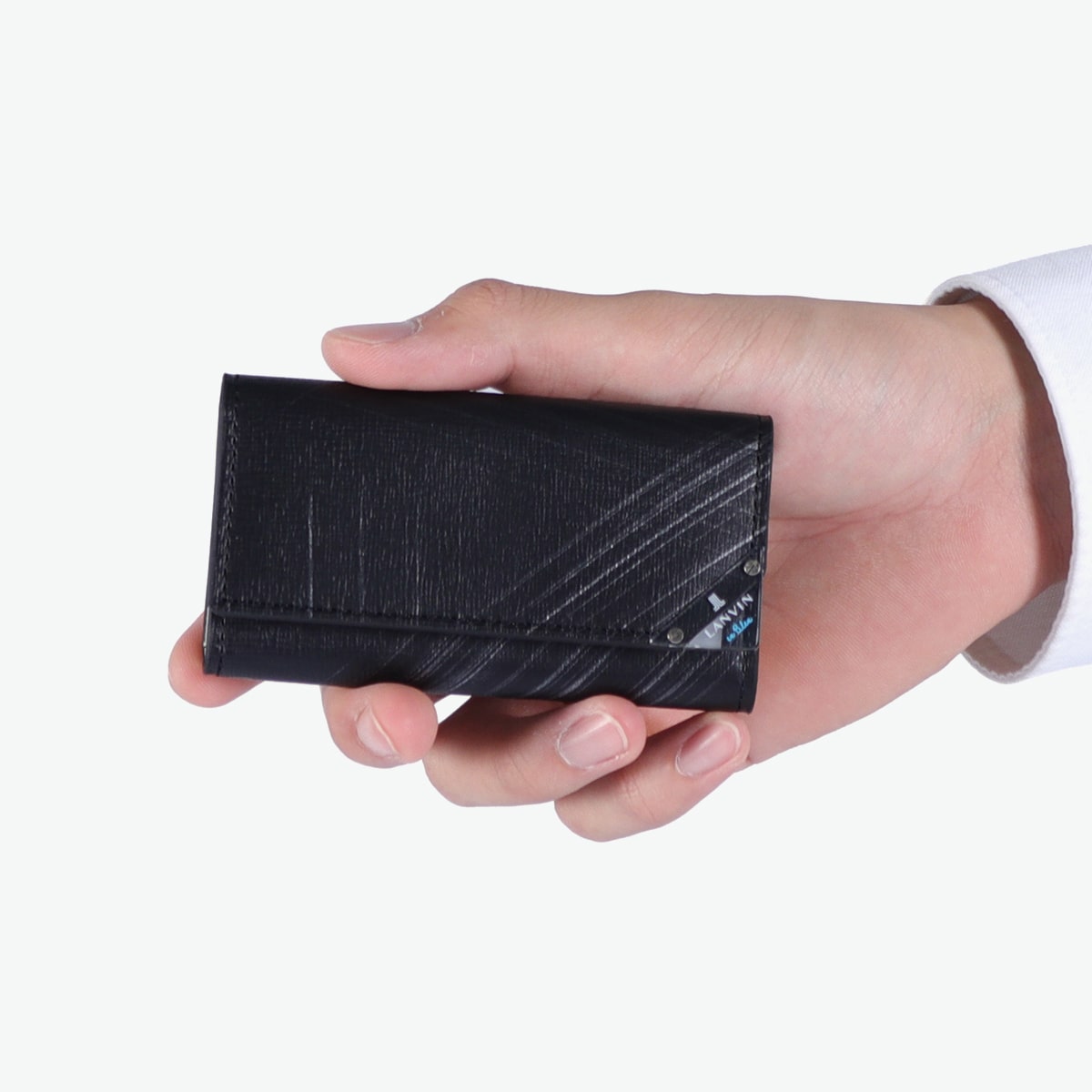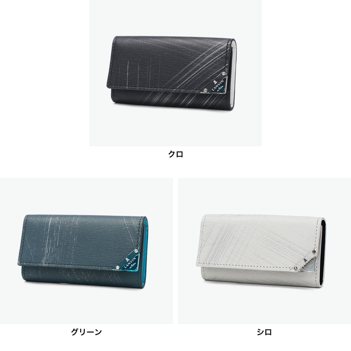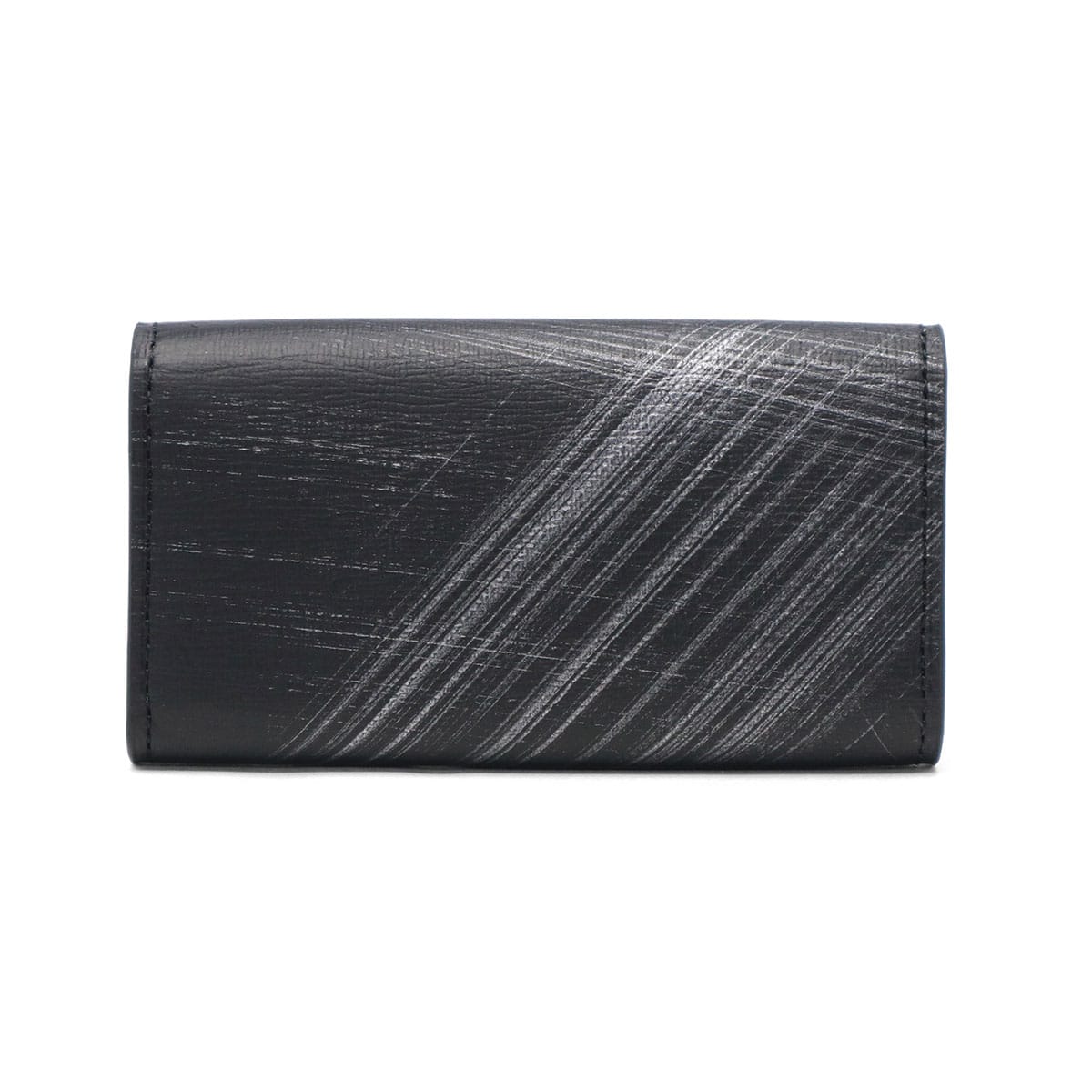 型押し牛革にシルバーの刷毛ムラプリントを施した、エレガントなキーケース。シルバープリントと角に施したクリアブローチは、光を通したり反射したりと、ダウンライトや太陽の下で映えるデザインに。ブローチの仕様は面を取っているため手触りがよく、樹脂の中にゴム成分を配合することによって割れにくい仕上がりになっているので、安心してお使いいただけます。