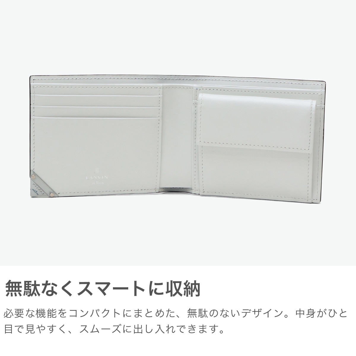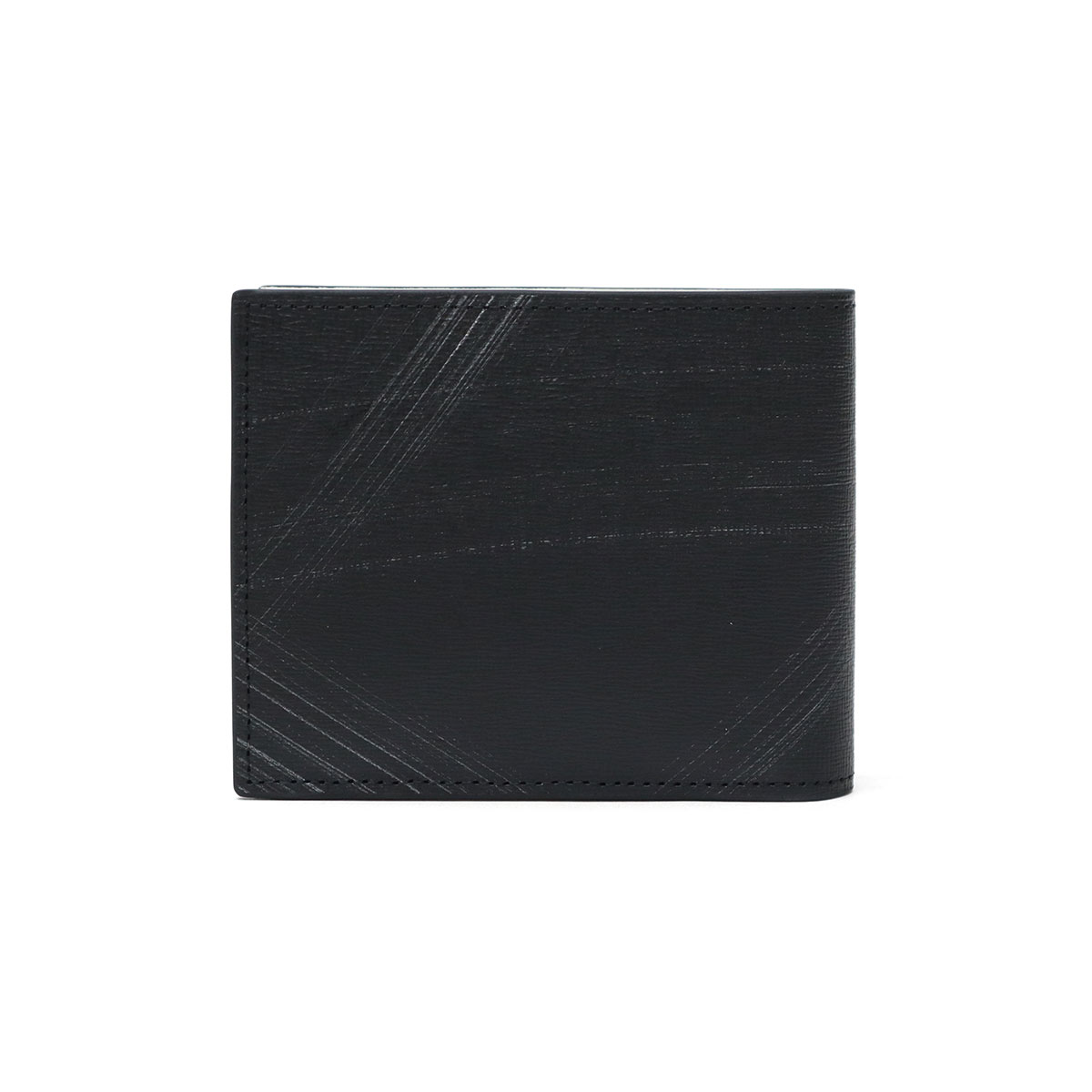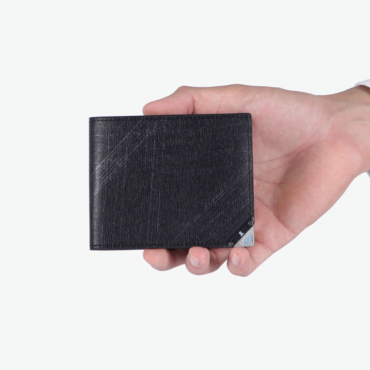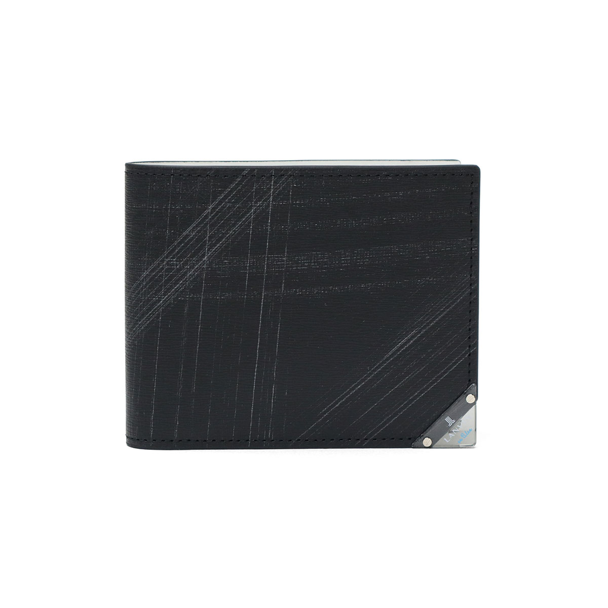 型押し牛革にシルバーの刷毛ムラプリントを施した、エレガントな二つ折り財布。シルバープリントと角に施したクリアブローチは、光を通したり反射したりと、ダウンライトや太陽の下で映えるデザインに。ブローチの仕様は面を取っているため手触りがよく、樹脂の中にゴム成分を配合することによって割れにくい仕上がりになっているので、安心してお使いいただけます。