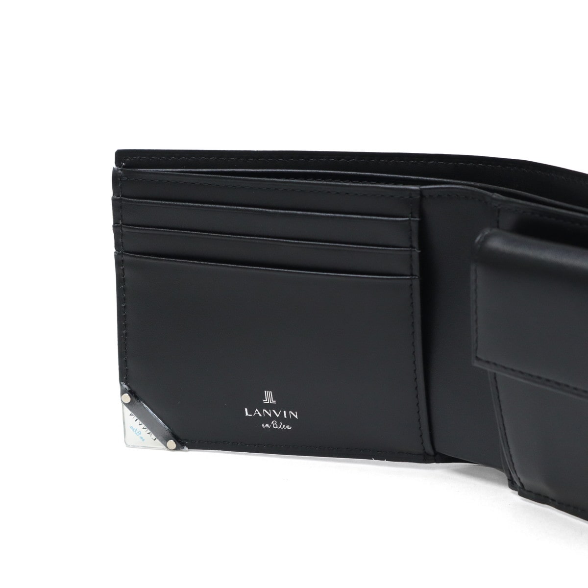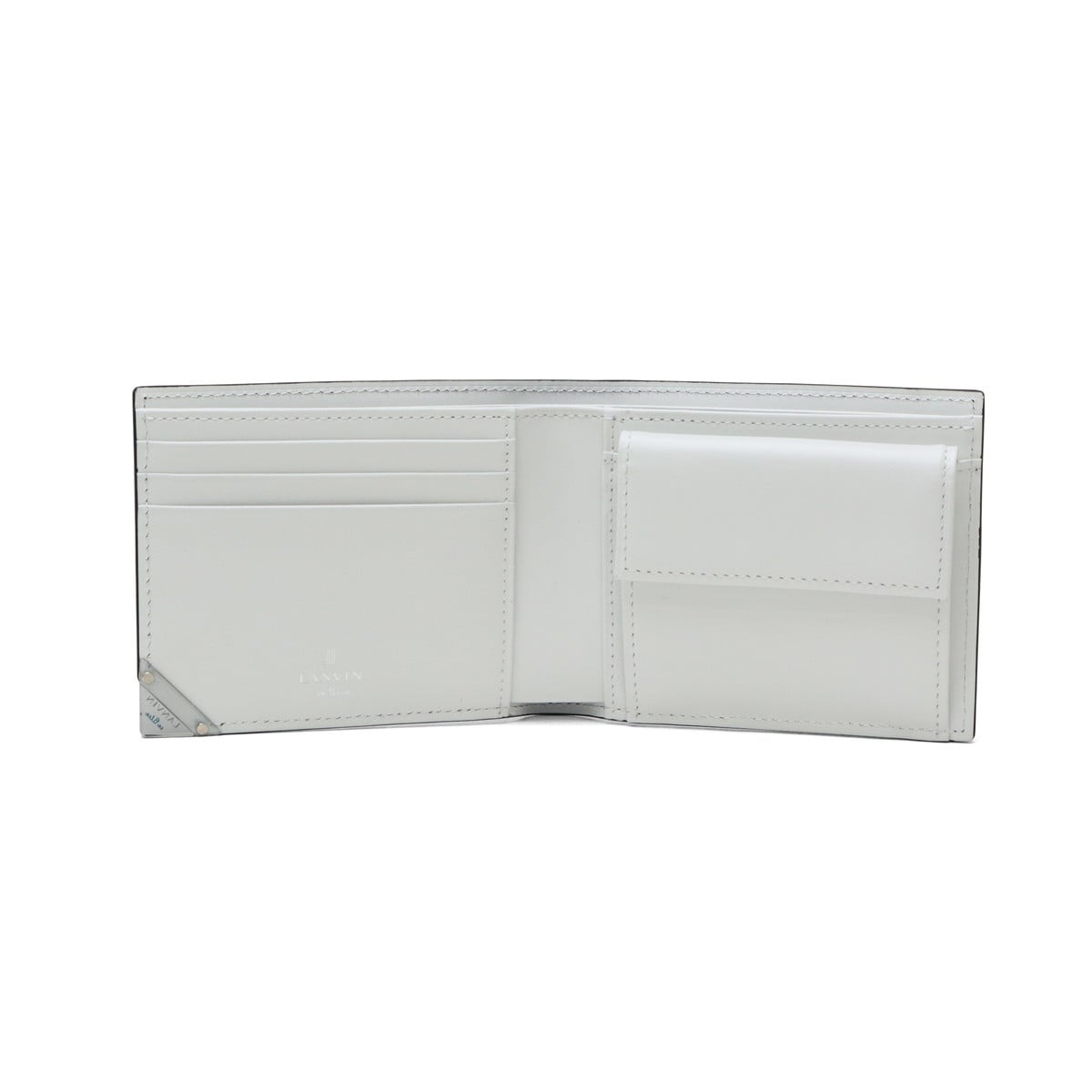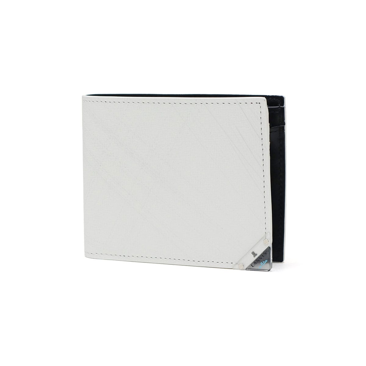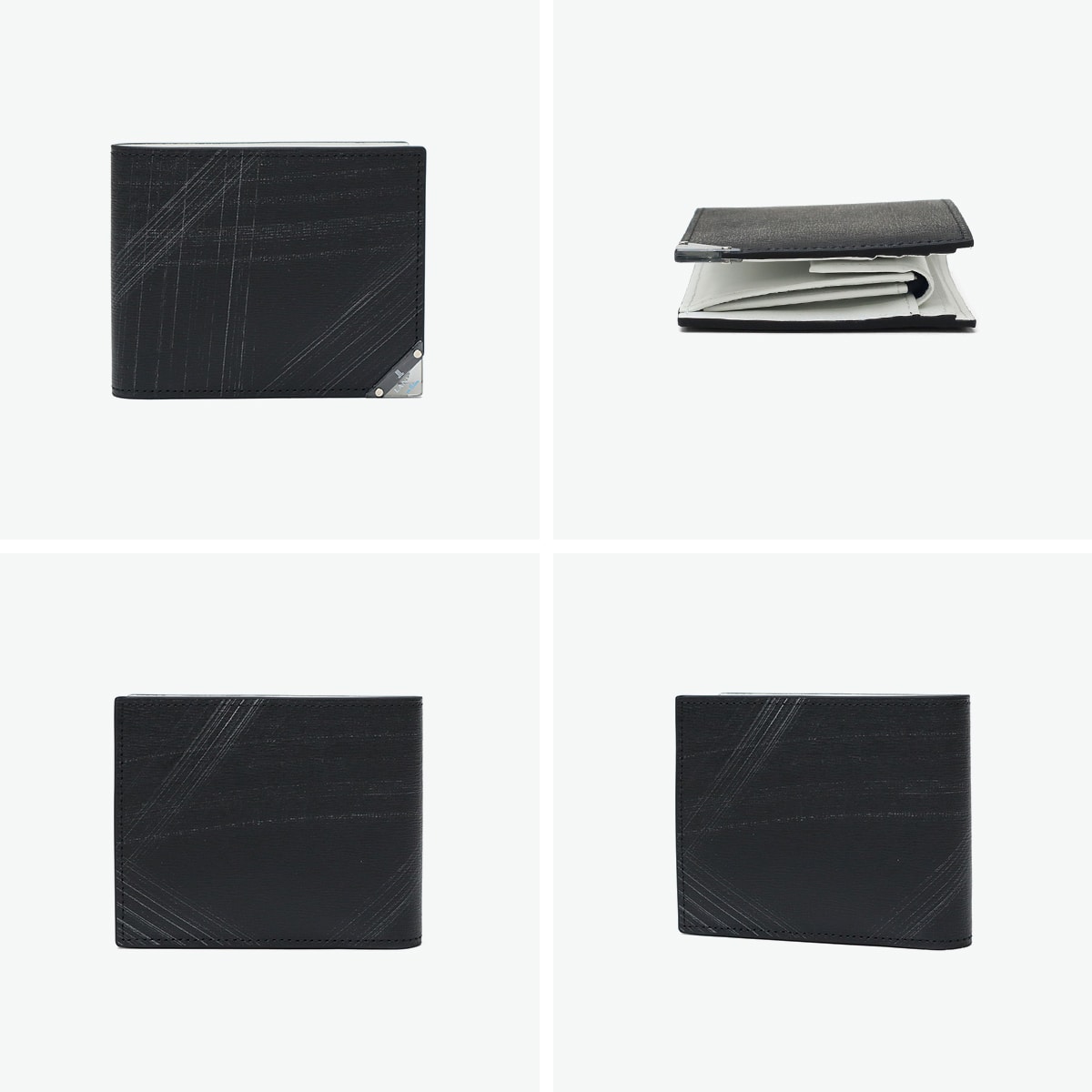 型押し牛革にシルバーの刷毛ムラプリントを施した、エレガントな二つ折り財布。シルバープリントと角に施したクリアブローチは、光を通したり反射したりと、ダウンライトや太陽の下で映えるデザインに。ブローチの仕様は面を取っているため手触りがよく、樹脂の中にゴム成分を配合することによって割れにくい仕上がりになっているので、安心してお使いいただけます。