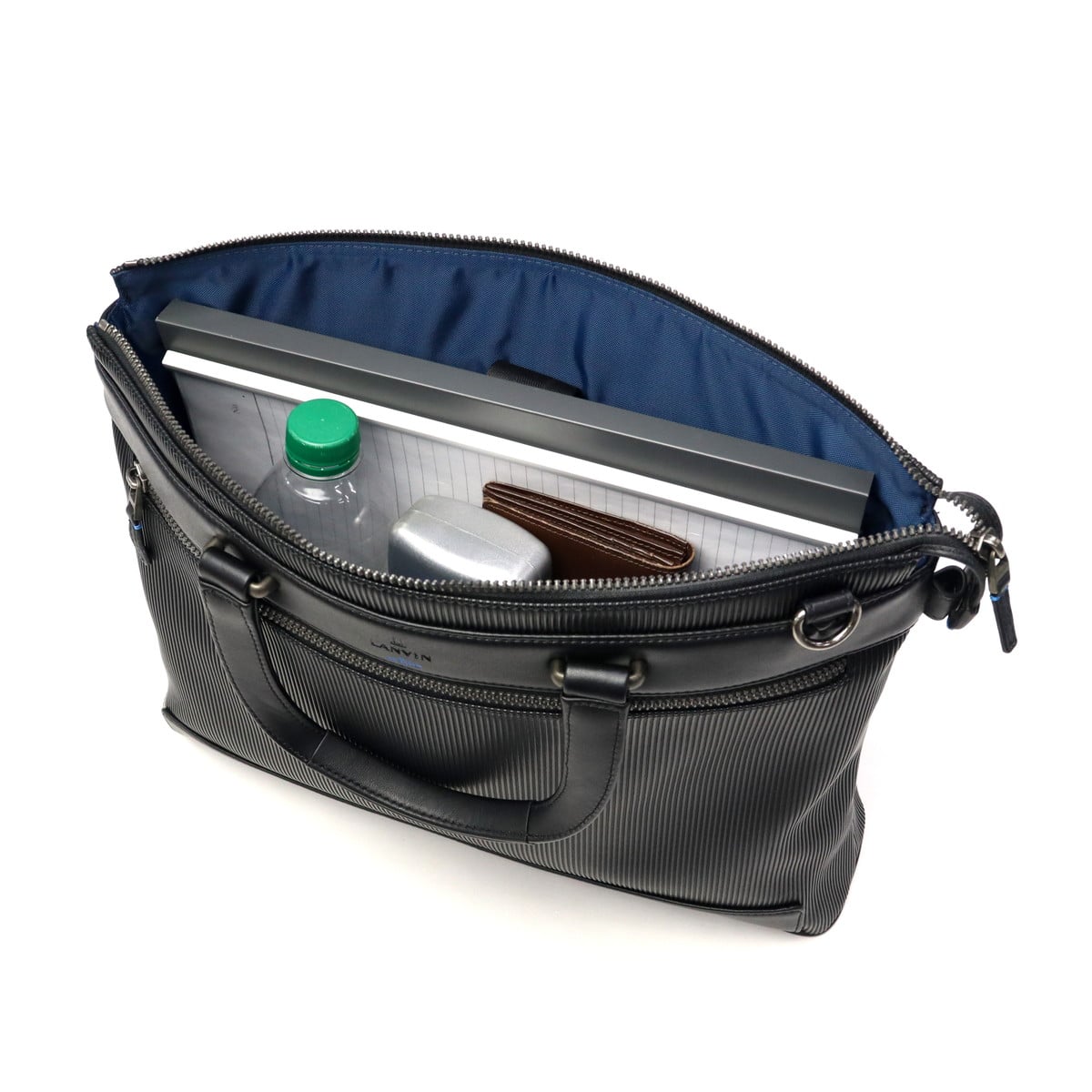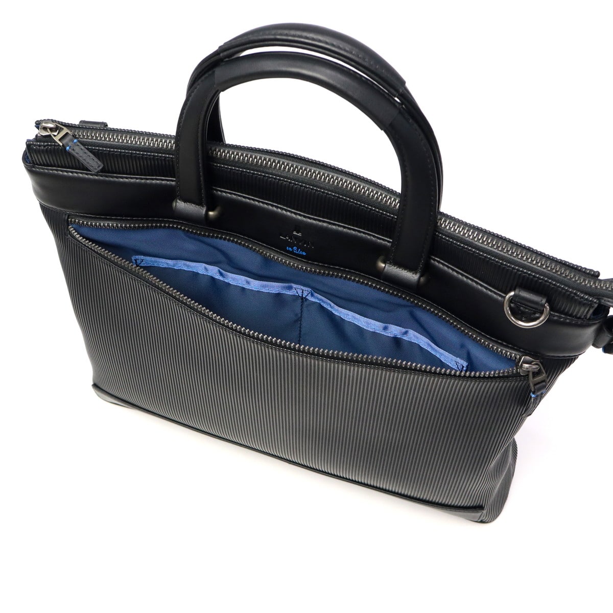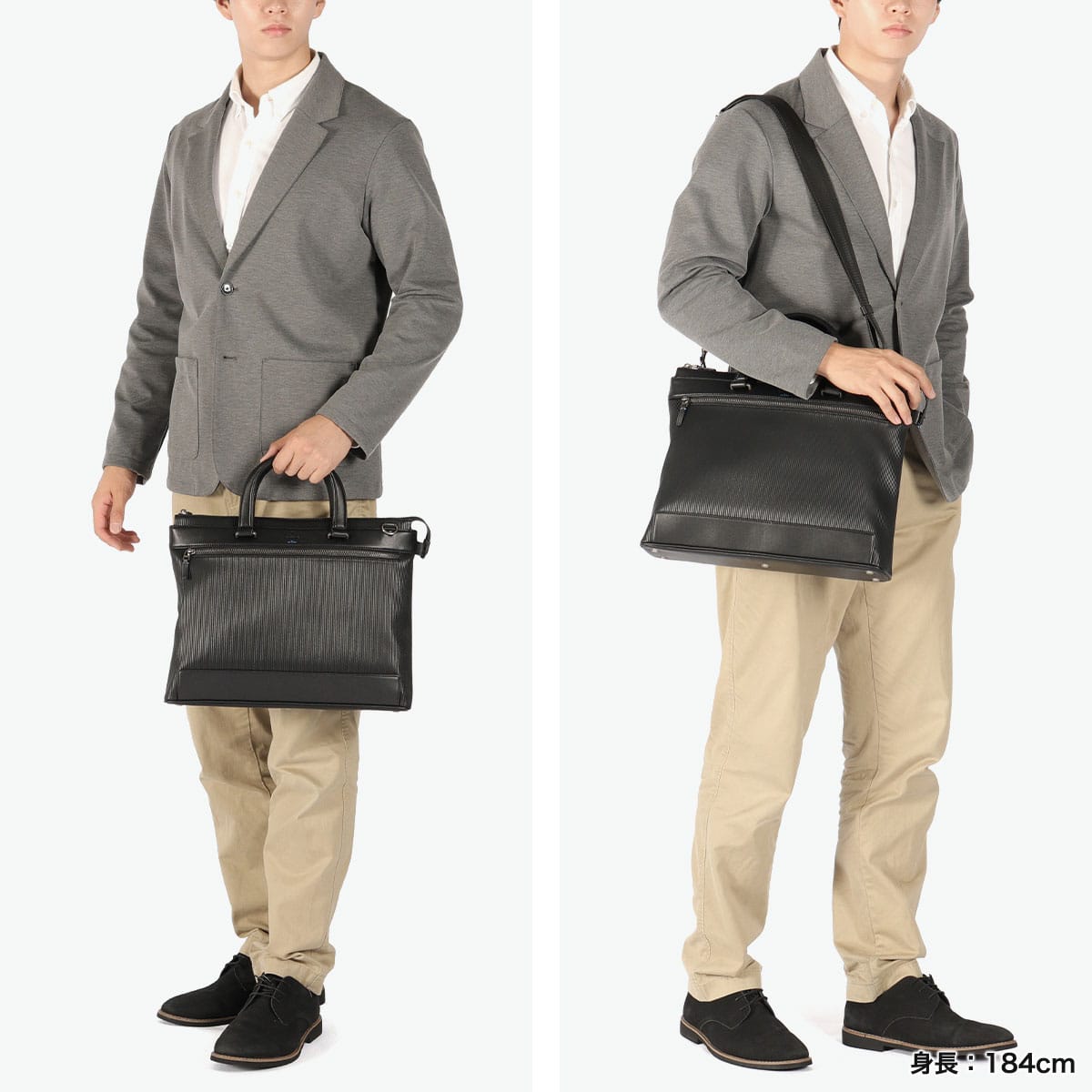 ラバー調の凹凸が特徴的なPVC素材を使用した『バンプ』シリーズのビジネスバッグです。耐水性・耐摩耗性に優れた高強度素材で、機能性とデザイン性を両立。立体感のあるストライプ柄が都会的なビジカジスタイルを引き立てます。A4対応サイズでPC収納や多彩なポケットを装備。手持ちと肩がけの2WAY仕様で、通勤から出張までスマートに活躍します。