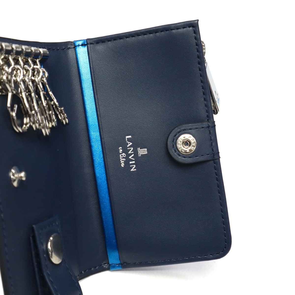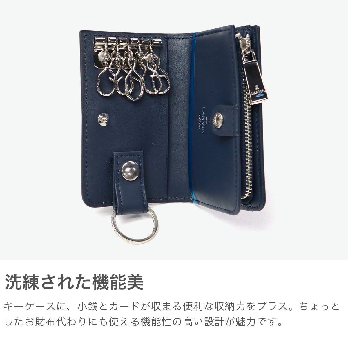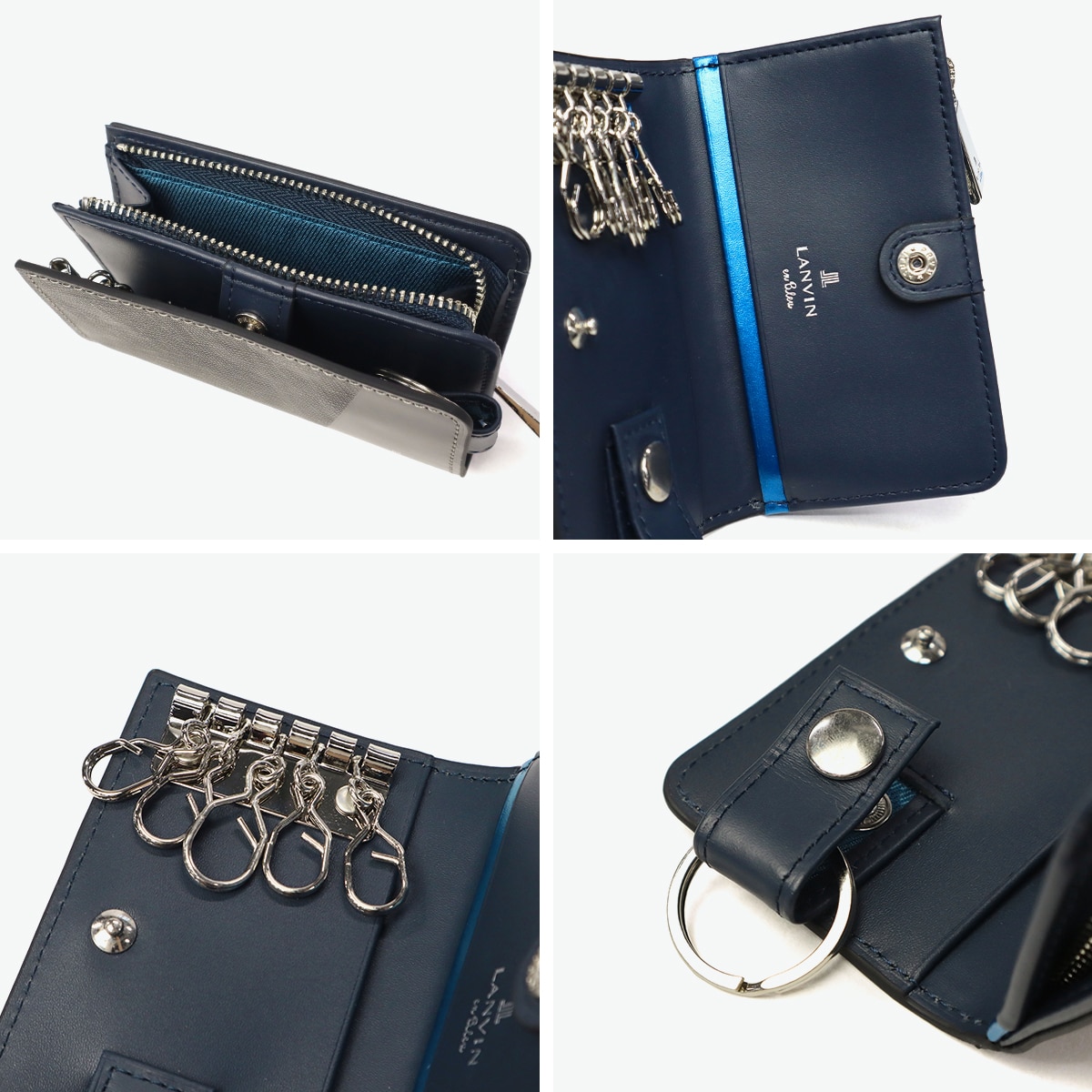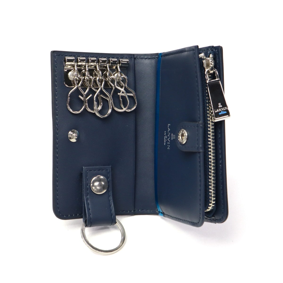 シックで上品な艶感が魅力のガラスレザーに部分的にサフィアーノ調のエンボス加工を施し、アパレル等で多用されるLANVIN en Bleuらしい切り替えを表現した『パーシャル』シリーズのキーケース。光をイメージしたメタリックブルーカラーを内装の一部分に使用することで、スタイリッシュで洗練されたデザインに仕上げています。小銭入れも備え、ちょっとした外出にも対応できる実用性の高いアイテムとなっています。