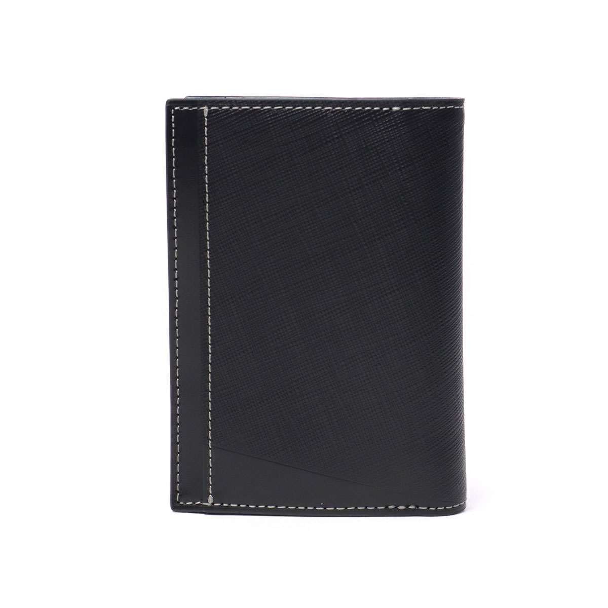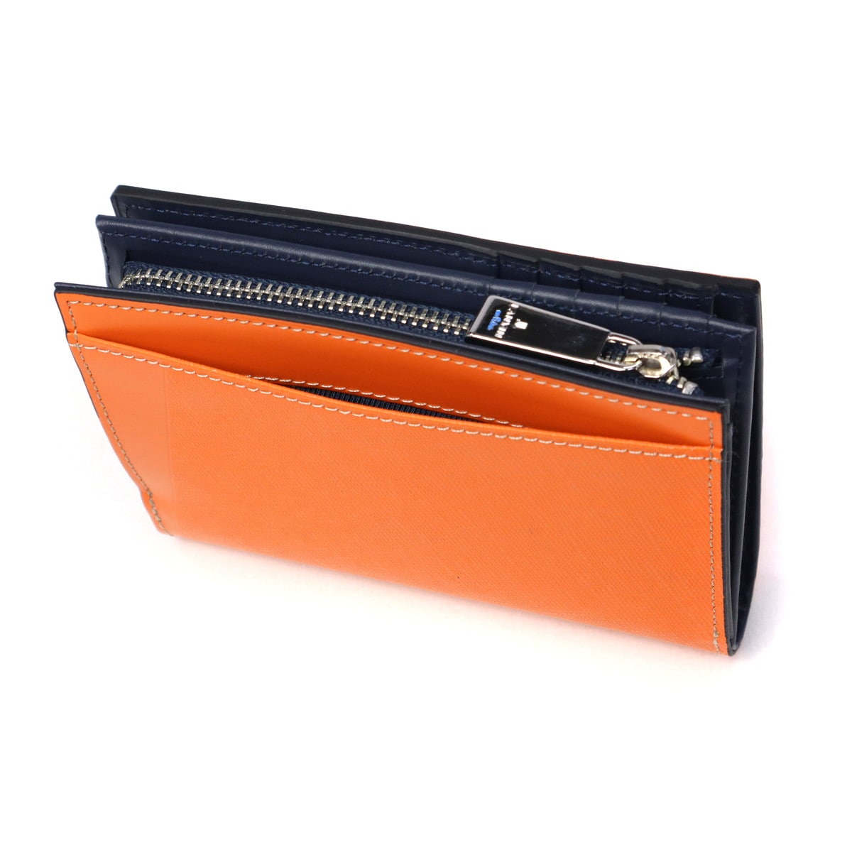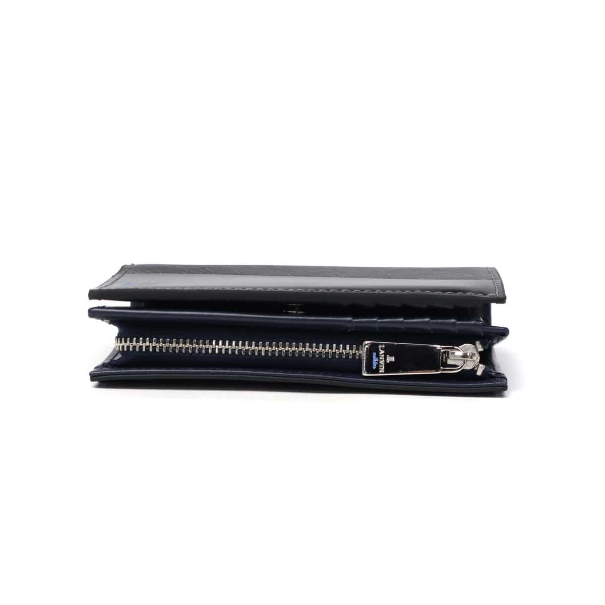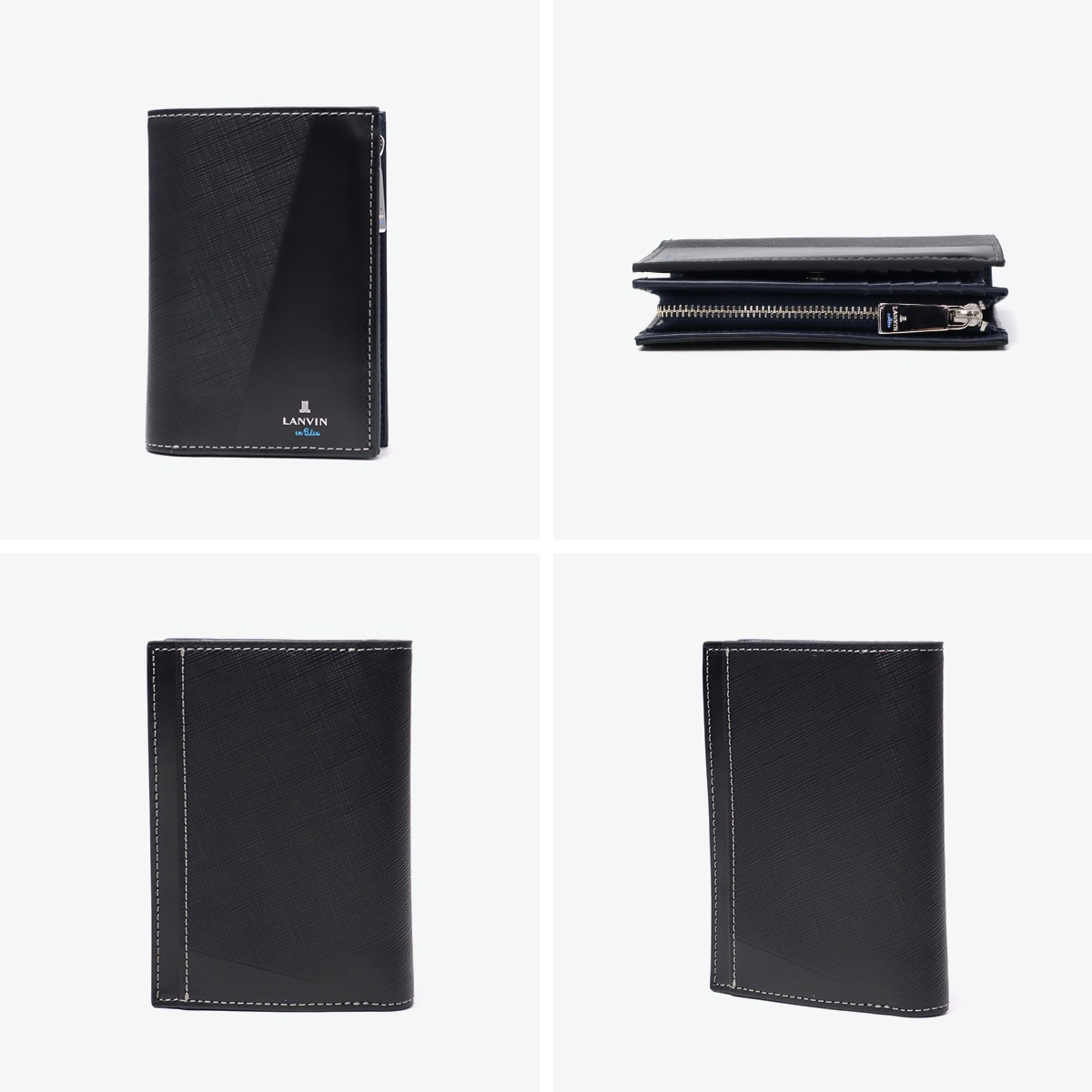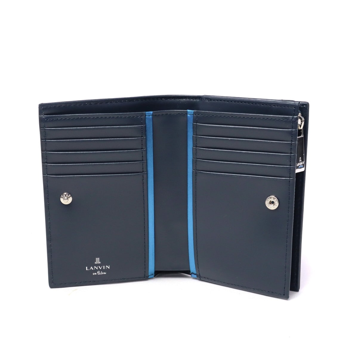シックで上品な艶感が魅力のガラスレザーに部分的にサフィアーノ調のエンボス加工を施し、アパレル等で多用されるLANVIN en Bleuらしい切り替えを表現した『パーシャル』シリーズの二つ折り財布です。光をイメージしたメタリックブルーカラーを内装の一部分に使用することで、スタイリッシュで洗練されたデザインに仕上げています。大きく開いて見やすい小銭入れや豊富なカードポケットなど、機能性も充実。手に馴染むコンパクトなサイズ感で、日常使いにぴったりのアイテムです。