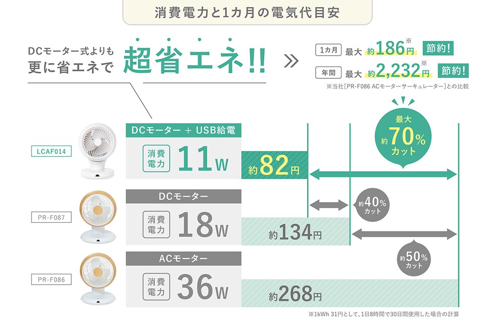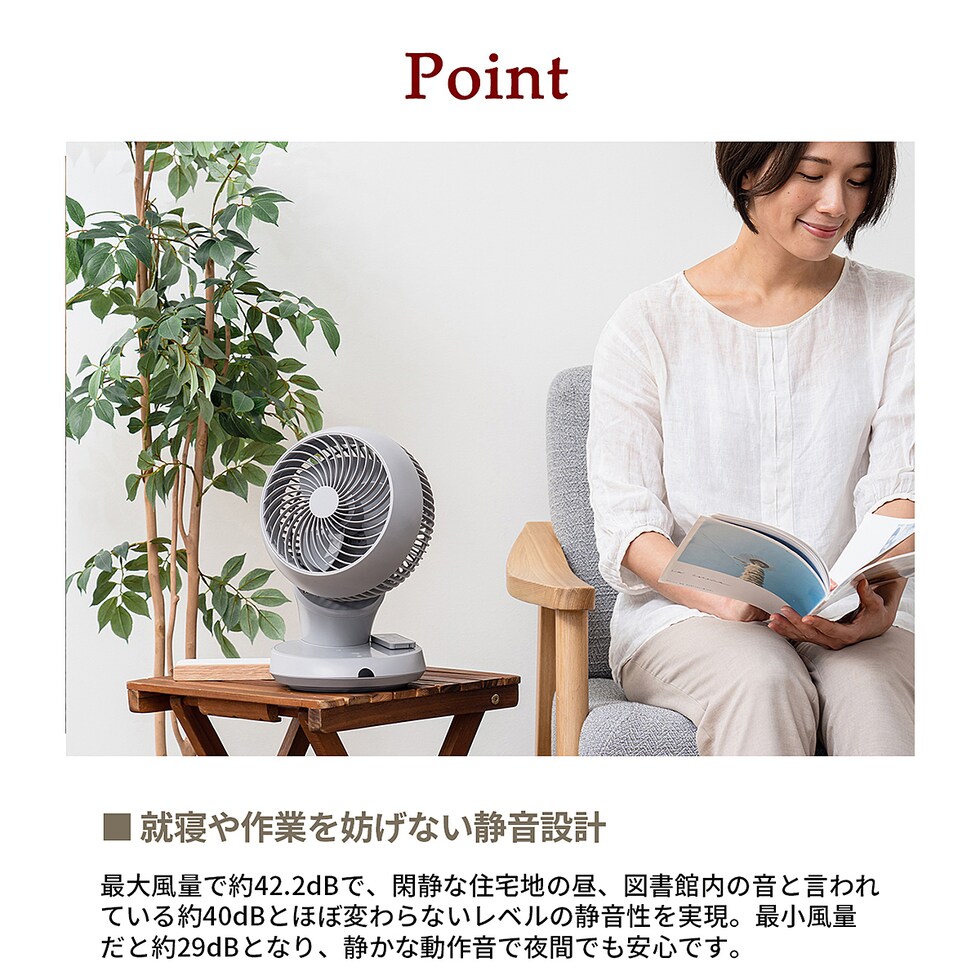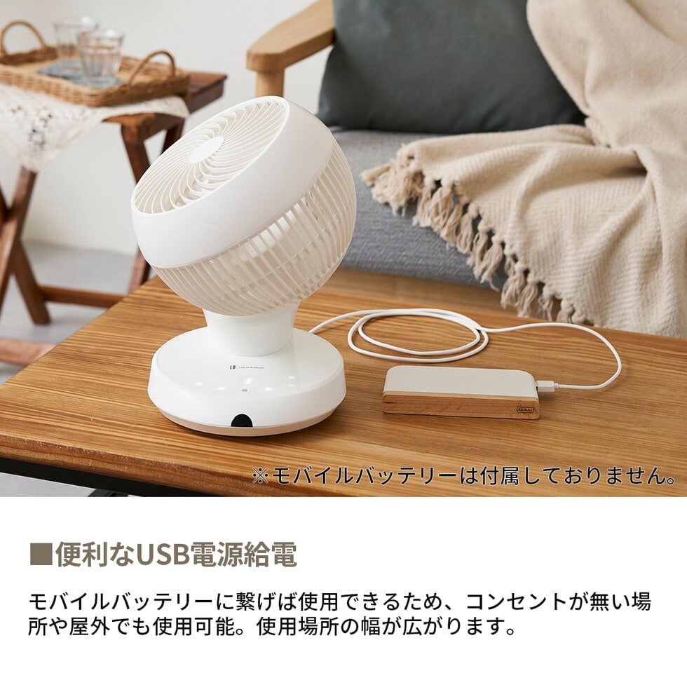 省エネDCモーターを使用し、更にUSBケーブルでの給電で消費電力を抑え超省エネ化を実現したサーキュレータ。コンパクトで静音ながら、約18畳まで対応しパーソナルユースで大活躍!約360度の3D首振りと左右自動首振り付きで、効率よく部屋の空気を循環します。エアコンと併用すればさらに電気代の節約にもなり、家計にも環境にも優しいアイテムです。