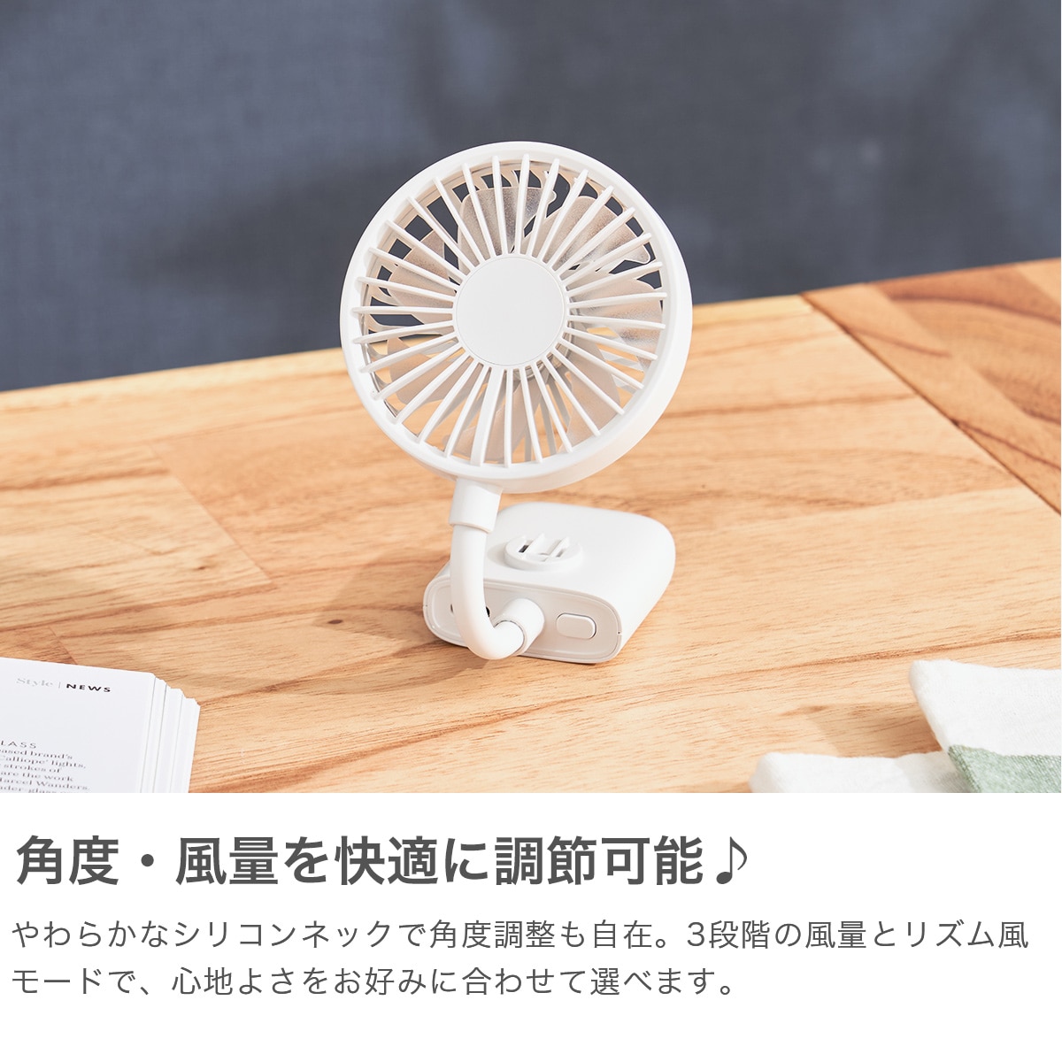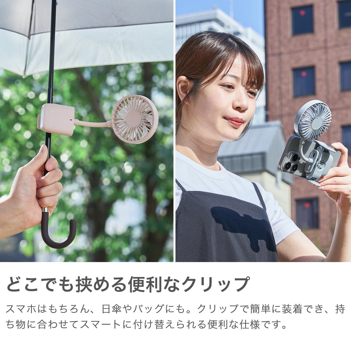スマホや日傘にも取り付け可能な薄型クリップファン。片手でスマホを操作しながら、もう片方で荷物を持つことができるので、外出時に便利です。約2.2cmの超薄型設計で携帯にもぴったり。クリップで日傘やバッグに取り付けられ、風量3段階調整可能。フレキシブルなシリコン製の角度調節で、どこでも涼しさを届けてくれます