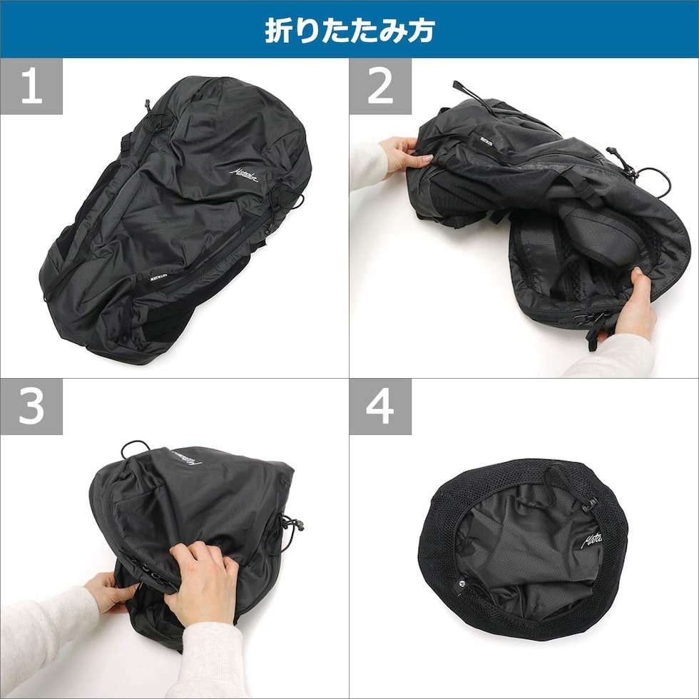 快適で柔軟な動きを実現する革新的なフレームを採用。肩から腰にかけて重さを均等に分散させ、ユーザーの動きに合わせてサポートしてくれます。さらに、半分にひねって折り畳み、付属のメッシュバッグに入れることで持ち運びも簡単。取り出すとスプリングスチールフレームが瞬時にパックの形状を復元します。
