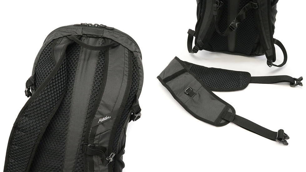 通気性の高いメッシュ素材を使用したリュックストラップとバックパネル。さらに、フィット感を高めることにより荷物の重量を感じさせないチェストストラップやウエストベルトを装備。ウエストベルトはベルクロ留めで着脱可能な仕様となっており、必要に応じてお使いいただけます。
