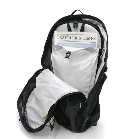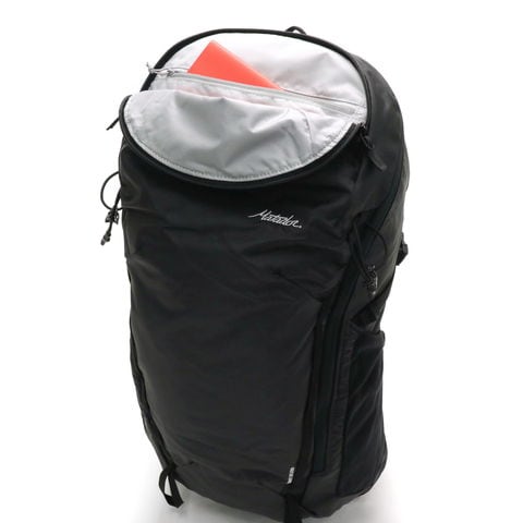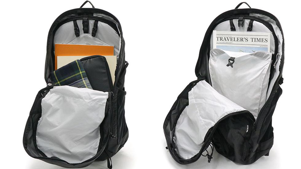 メインルームには開き具合が非対称のクラムシェルファスナーを採用し、バッグの底にある大きなアイテムへのアクセスを容易にします。内装に設けられたハイドレーションスリーブは1~3リットルのリザーバーに対応。給水用のチューブが通せる穴も背面に備わっています。