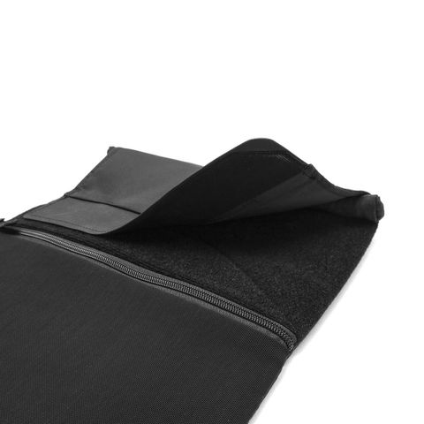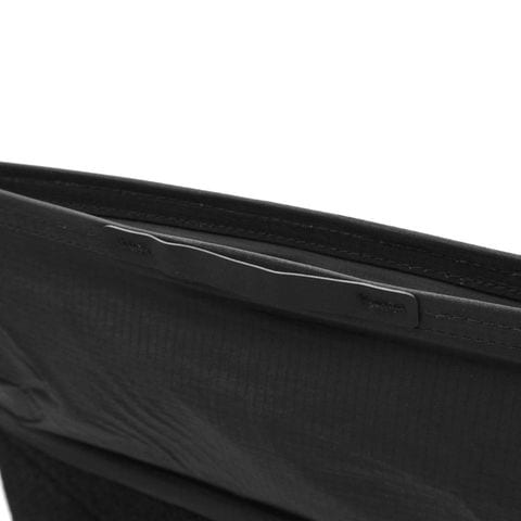 開口部はかぶせ式になっており、A4サイズ程度に対応。シームシールド構造のドライバッグを巻いておけばIPX6の防水機能を発揮します。外側には伸縮性のあるポケットを設けており、マウスや充電器などのアクセサリー類の収納に便利です。