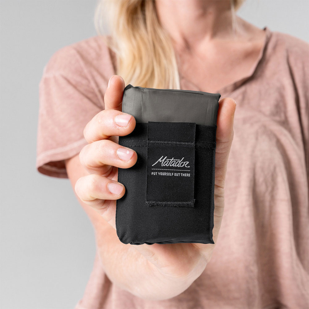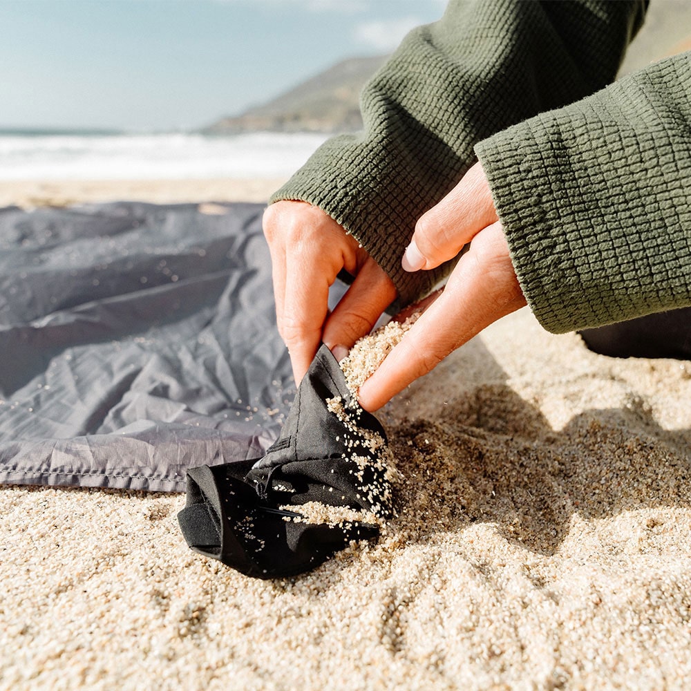 手のひらサイズに収納できるポケットブランケット。特許取得の「Easy-Packパターン」がガイドラインとなり、簡単に折りたためます。高品質で耐水性・耐久性に優れた素材を使用し、どこでも清潔でドライな状態をキープ。大人2?4人で使えるゆったりサイズながら、強風時に便利な超軽量ペグや砂や石を入れて重しにできるサンドポケット付きで、旅行やアウトドアでも安心のアイテムです。