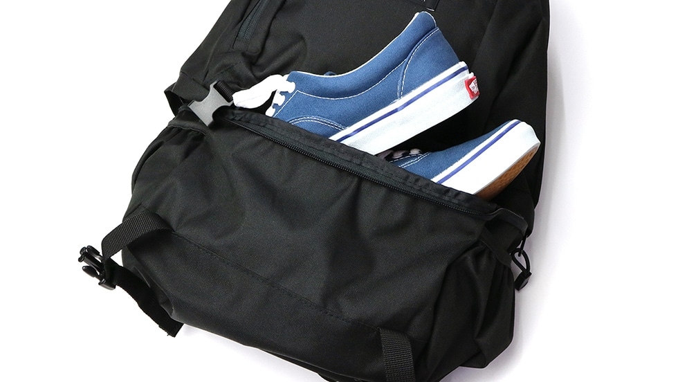 内部には開閉のできる仕切りが設けられており、メインルームの下部を別の収納部として使用することができます。一枚隔てて収納することができ、シューズや使用済みの衣類等の収納に便利です。