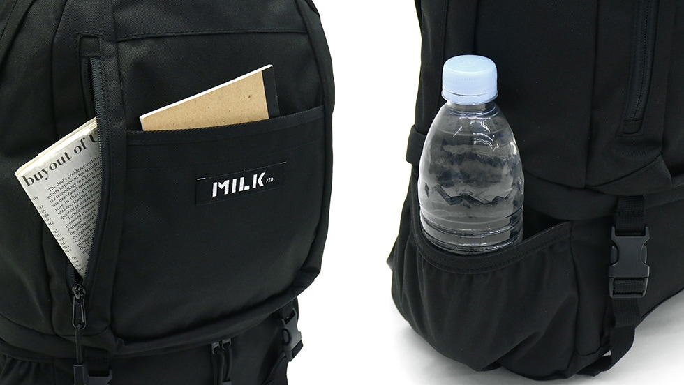 本体の外側にはジップポケットやベルクロ留めポケットを備え、小物類の管理もできる設計。頻繁に取り出したいアイテムは両サイドに設けられた、伸縮性を備えたポケットでサッと取り出すことができます。