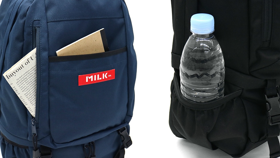 本体の外側にはジップポケットやベルクロ留めポケットを備え、小物類の管理もできる設計。頻繁に取り出したいアイテムは両サイドに設けられた、伸縮性を備えたポケットでサッと取り出すことができます。