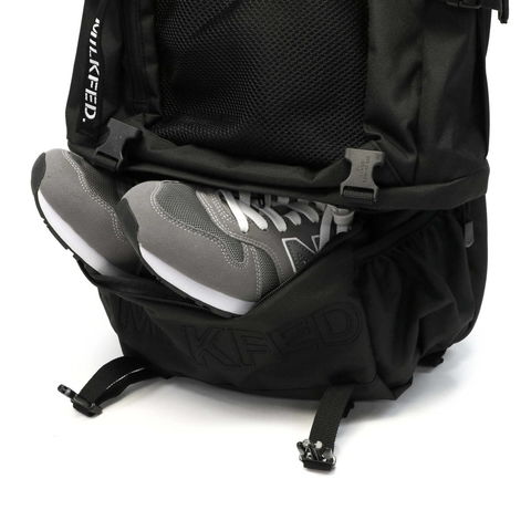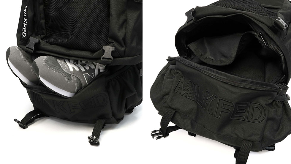 底面には、シューズなどを収納できるサブ収納部を装備。ポケット内の上部にメインルームと繋がるファスナーを設けており、全開にしてメインルームの容量を広げれば、B4サイズの収納も可能になります。収納力とともに、機能性を兼ね備えた設計がポイントです。