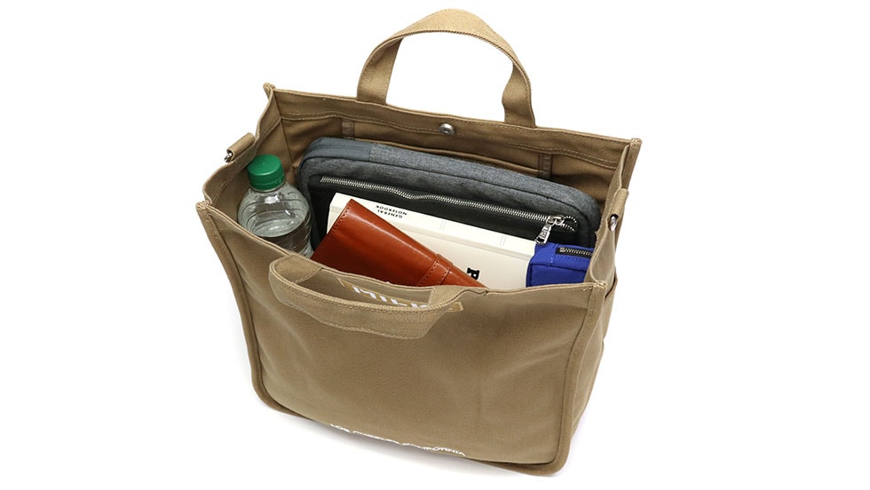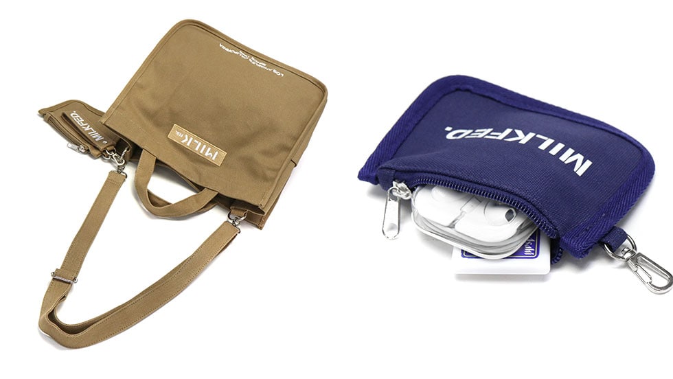 ショルダーストラップを取り外してトートバッグとして使用することもできるので、その日のスタイルに合わせた持ち方ができます。付属のポーチは、リップクリームやカードが入り、小物入れとして役立ちます。