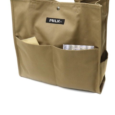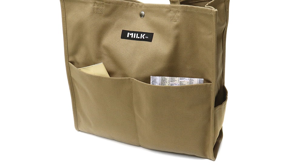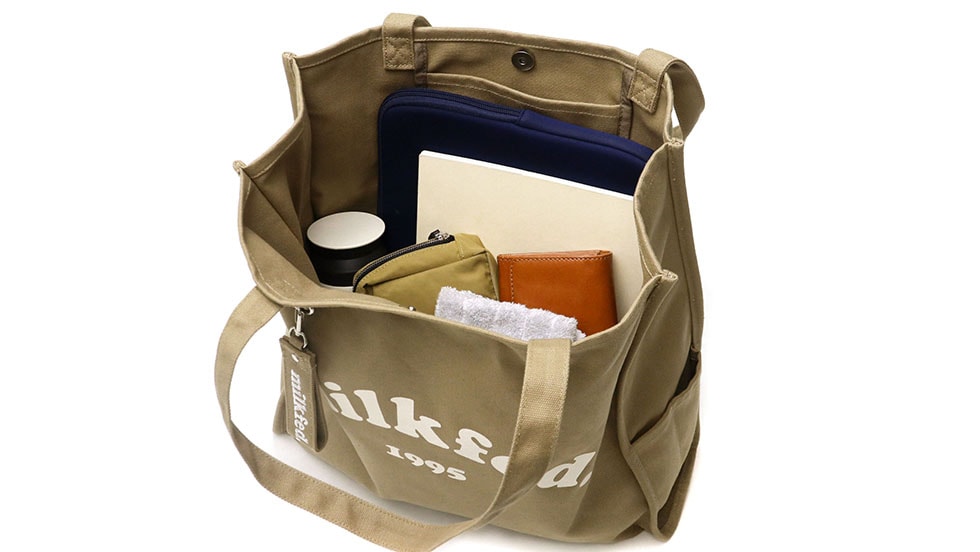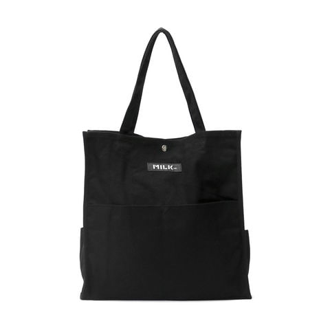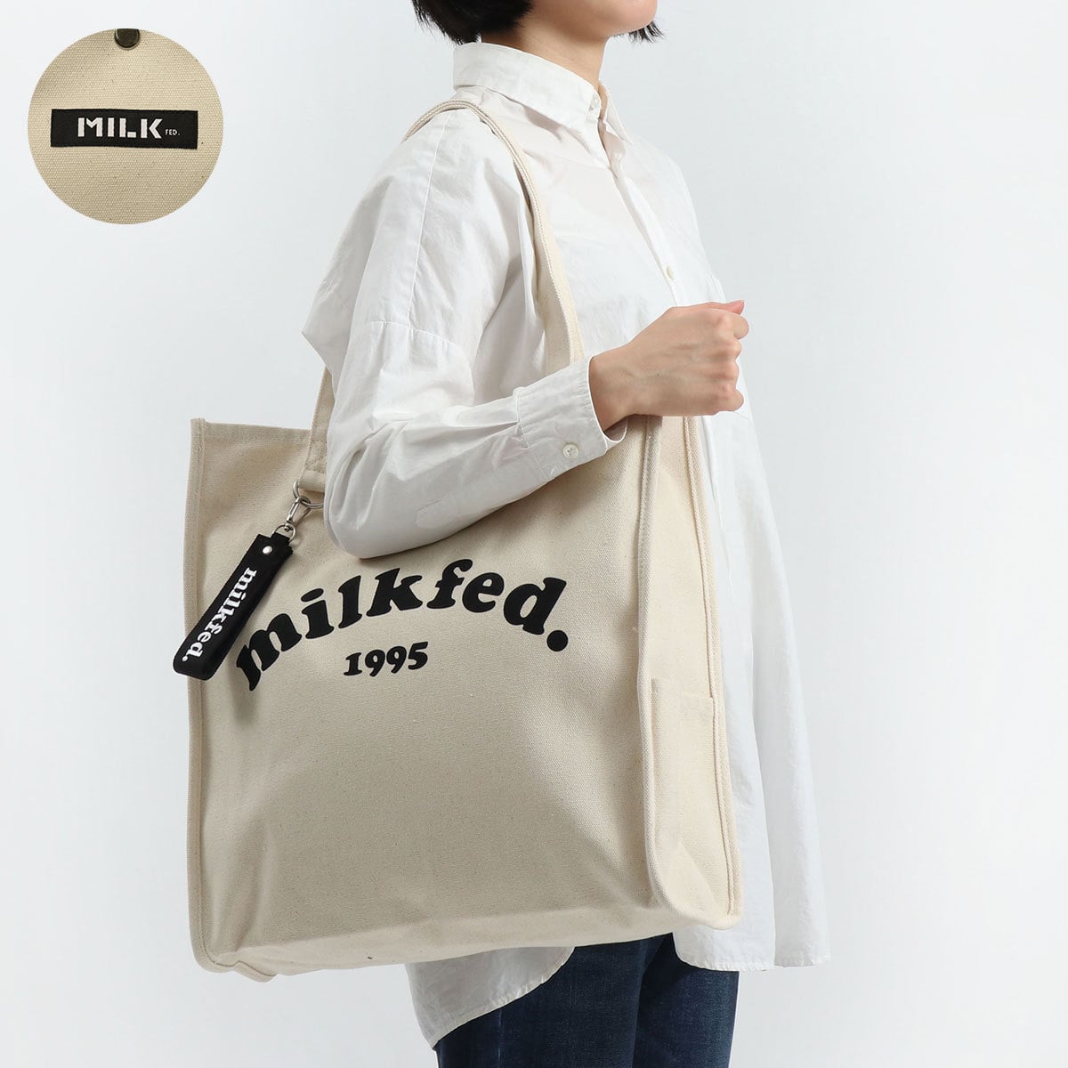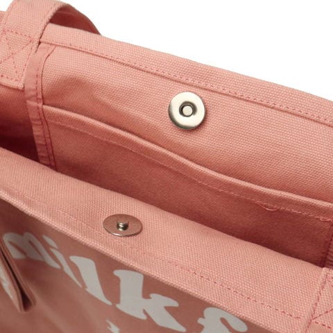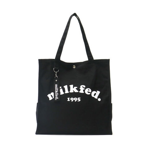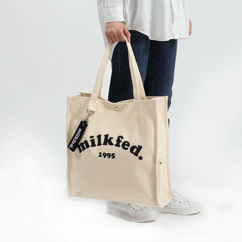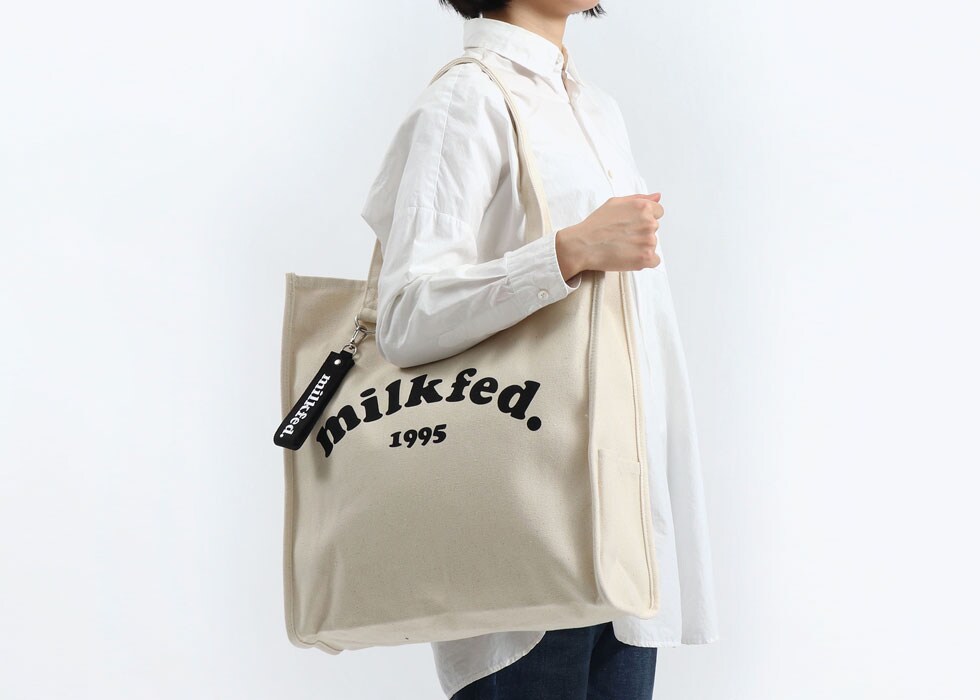 MILKFED.のポップで可愛らしい大きなロゴが特徴的な、スクエア型のトートバッグ。シンプルなデザインなので、ガーリーなスタイルからストリートなど、どんなコーデにもマッチしてくれます。カジュアルなキャンバス生地でデイリーに馴染みやすく、シーズン問わず使えて万能なアイテムです。
