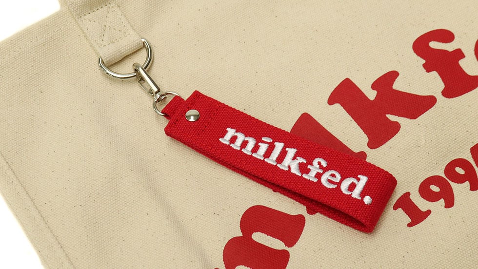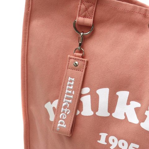 本体に備わったDカンには、MILKFED.オリジナルのロゴデザイン入りチャームが付属。チャームは取り外し可能なので、お気に入りのストラップやキーホルダーをつけて自分だけのオリジナルのバッグを演出して楽しむことができます。また、鍵の管理にも使えて実用的なのも高ポイントです。