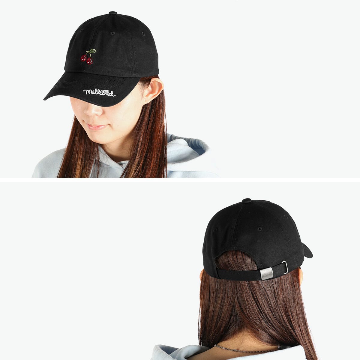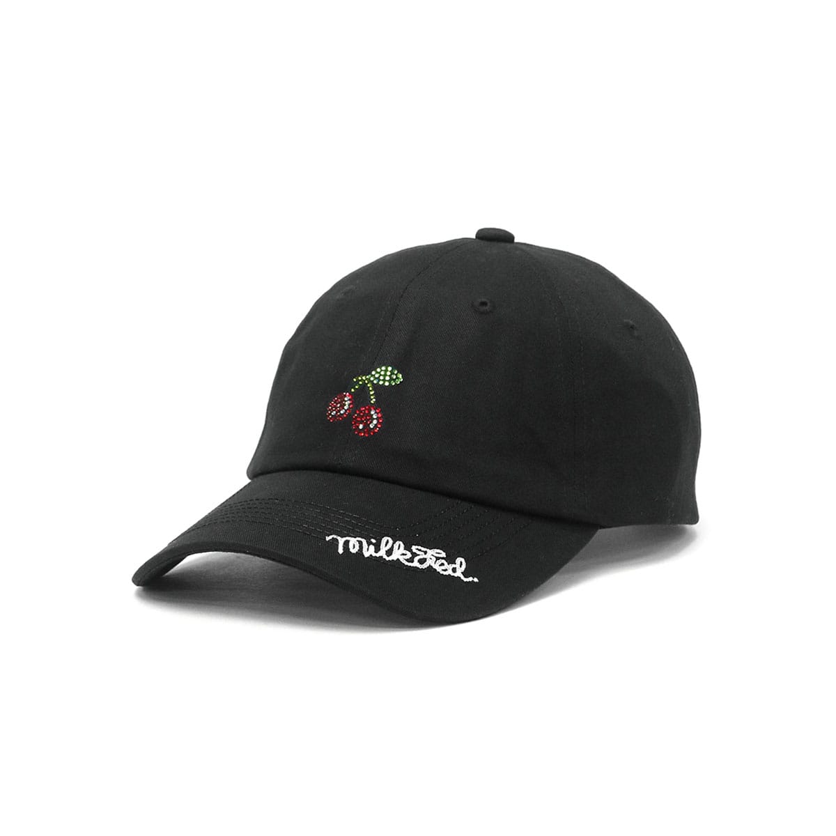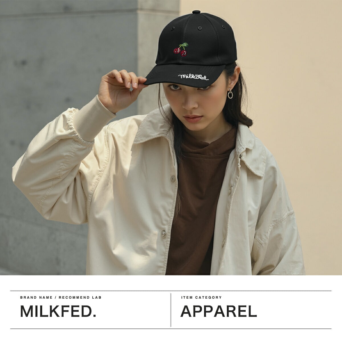 ラインストーンで描かれたチェリーとロゴ刺繍がポイントのベーシックなツイル素材のキャップ。懐かしい雰囲気のチェリー柄のラインストーンモチーフが目を惹きます。さらに、「MILKFED.」では新しいデザインとなる、ツバ先にロゴ刺繍を入れたアイテムとなっています。
