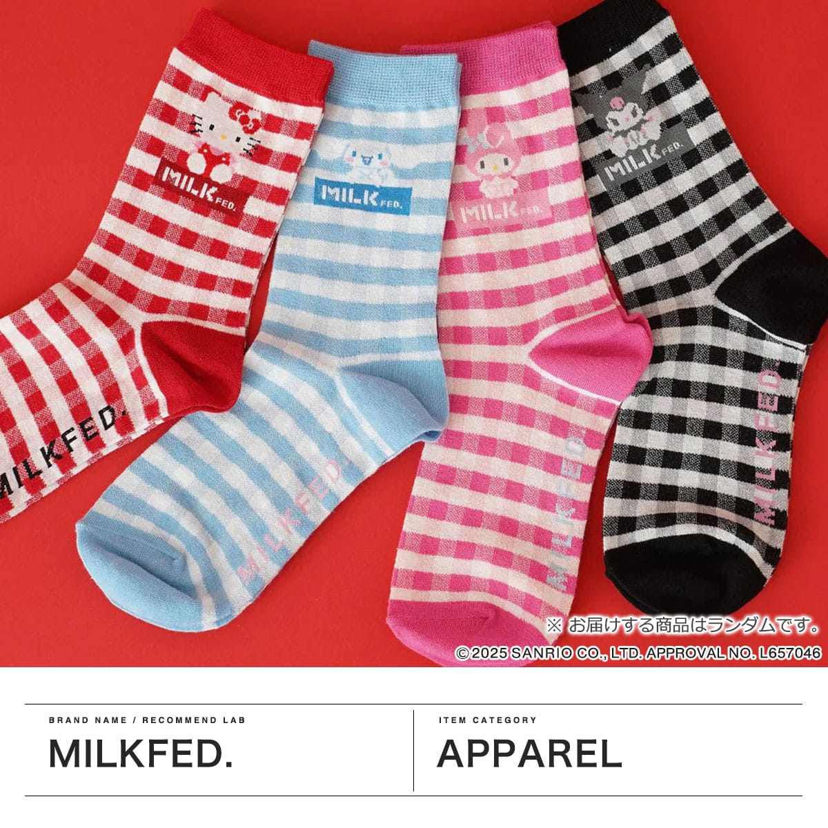 サンリオキャラクターズとMILKFED.によるスペシャルなコラボレーションアイテムが発売!ギンガムチェックが可愛い特別感のある靴下です。ハローキティ、マイメロディ、クロミ、シナモロールの中から1つお届け。どれが出るかは届いてからのお楽しみです♪