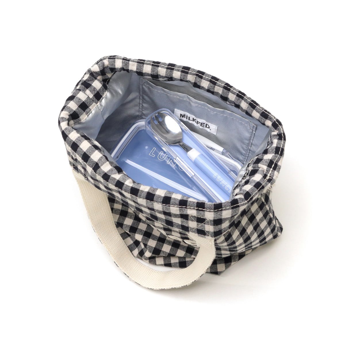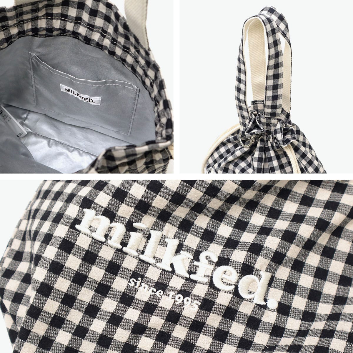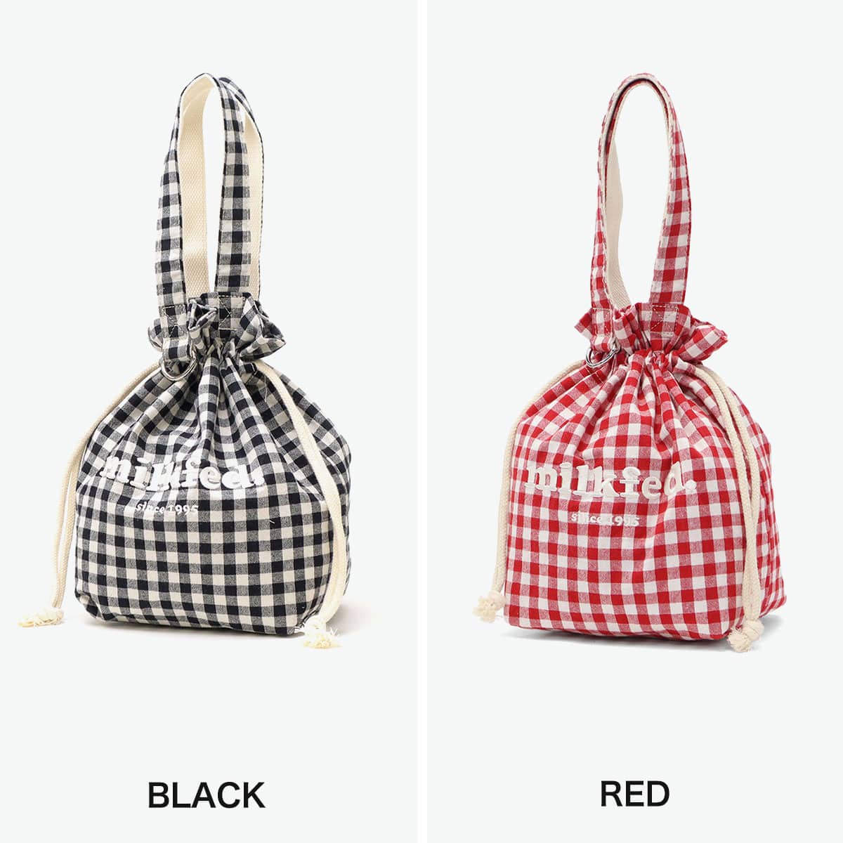 ギンガムチェックにブランドロゴの刺繍がポイントのランチバッグ。開閉がしやすく、絞った時のフォルムが可愛い巾着型です。ランチバッグとしてはもちろん、普段使い用のバッグとしても◎。コーデのアクセントになる愛らしいデザインに仕上がっています。