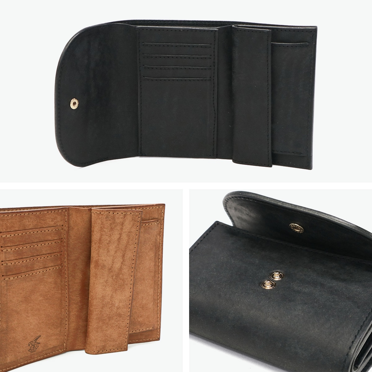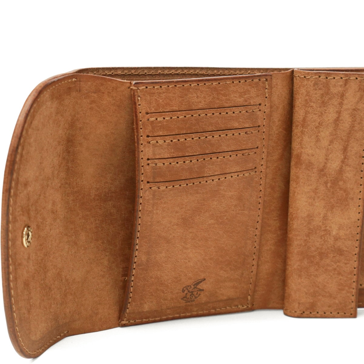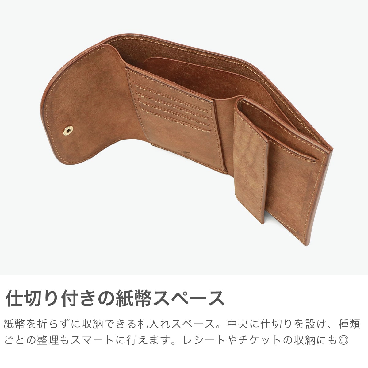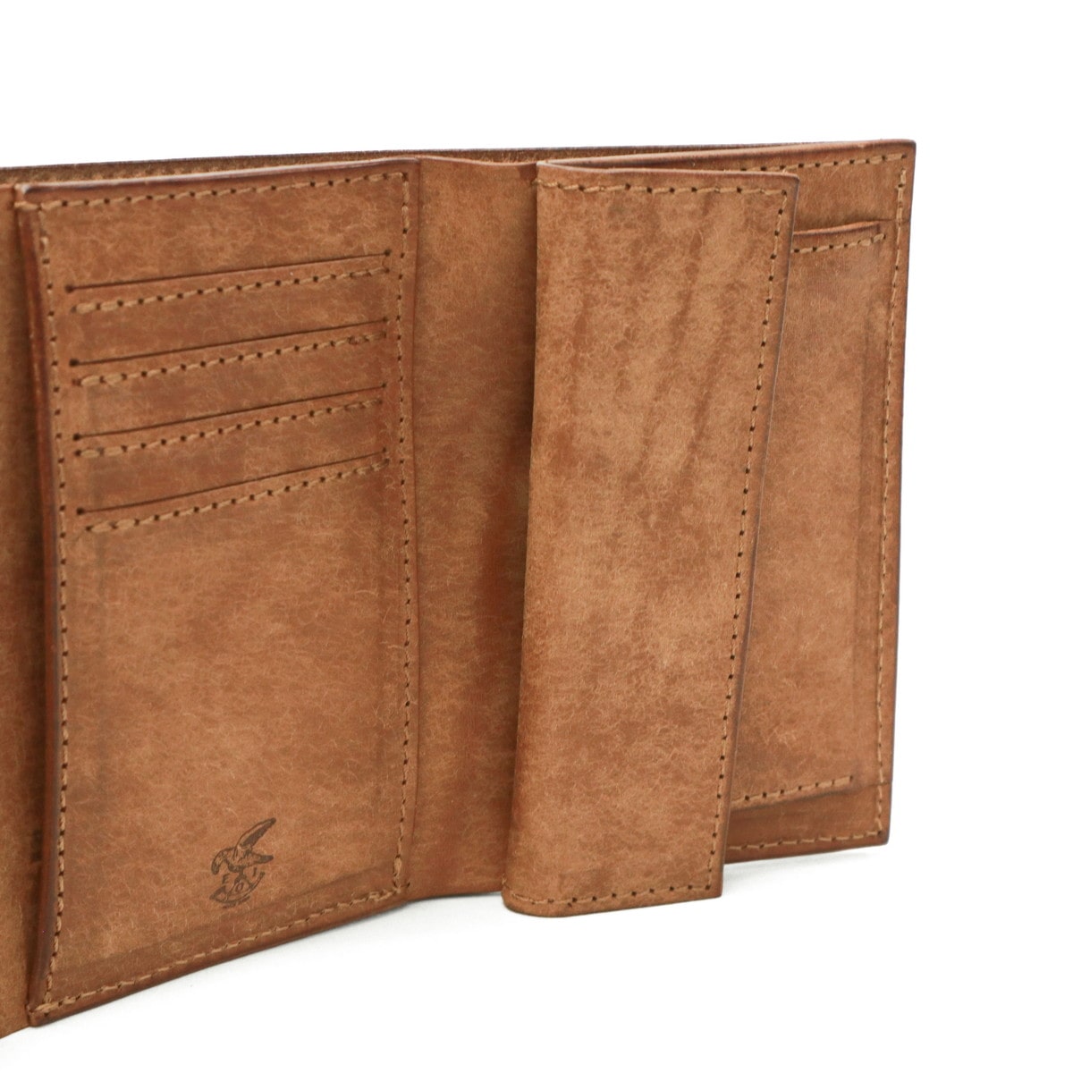 イタリア・フィレンツェ生まれのプエブロレザーを使用した三つ折りウォレット。プエブロレザーは、生後2年以上の雌牛をベジタブルタンニンで鞣した後、ニートフットオイルをじっくりと浸透させる“バケッタ製法”で作られた革。アールを描くフラップの定番デザインで、長く愛用できます。